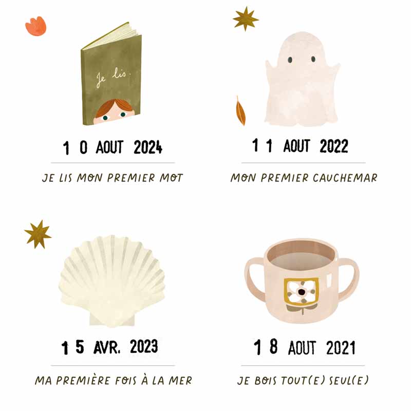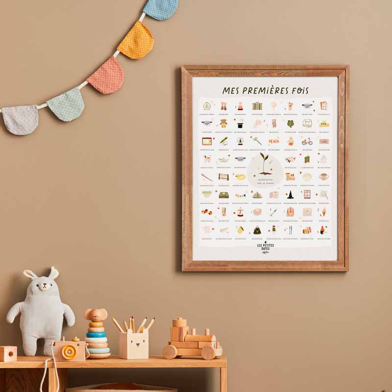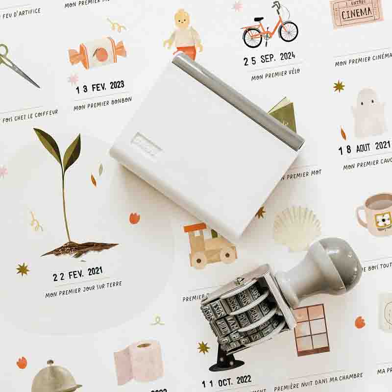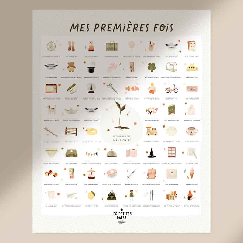 L’affiche « Mes Premières Fois » est un cadeau de naissance idéal ! Ici dans sa version illustrée par une artiste bretonne, Léa Le Pivert. Une jolie affiche pour la chambre de bébé mais pas seulement. Grâce au tampon dateur vous venir inscrire la date de toutes les premières fois de bébé : de sa naissance, à son premier mot, en passant par son premier jour sans couche. Des souvenirs gravés pour la vie !