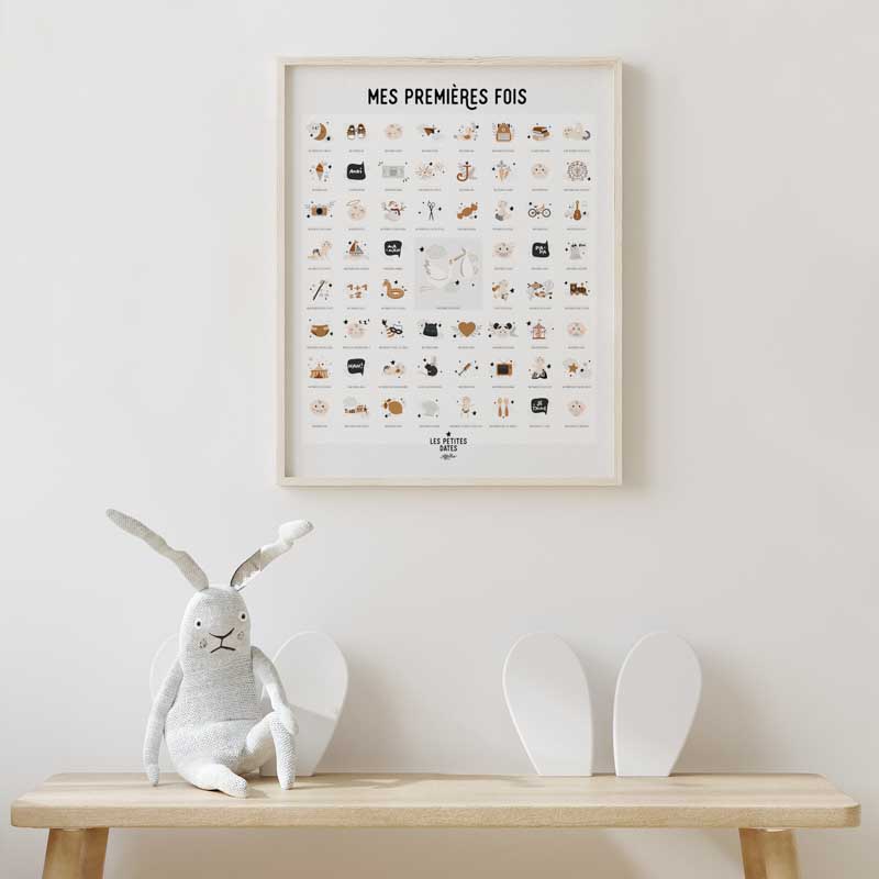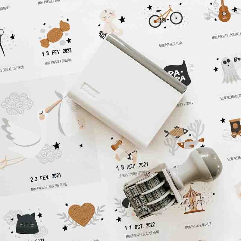 L’affiche « Mes Premières Fois » est un cadeau de naissance idéal ! Une jolie affiche pour la chambre de bébé mais pas seulement. Grâce au tampon dateur vous venir inscrire la date de toutes les premières fois de bébé : de sa naissance, à son premier mot, en passant par son premier jour sans couche. Des souvenirs gravés pour la vie !