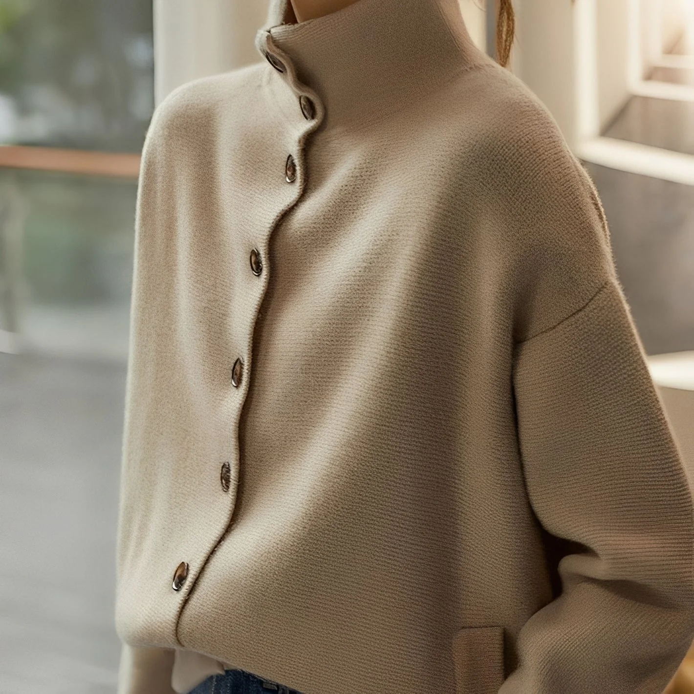 Le pull col roulé « Amelia » charme par sa coupe ample et son tricot épais et douillet. La couleur camel pâle donne au pull une apparence classique et raffinée. Les détails des boutons ajoutent une touche subtile au design unique. Parfait pour les journées fraîches d’automne et d’hiver, que ce soit au quotidien ou pour les loisirs.