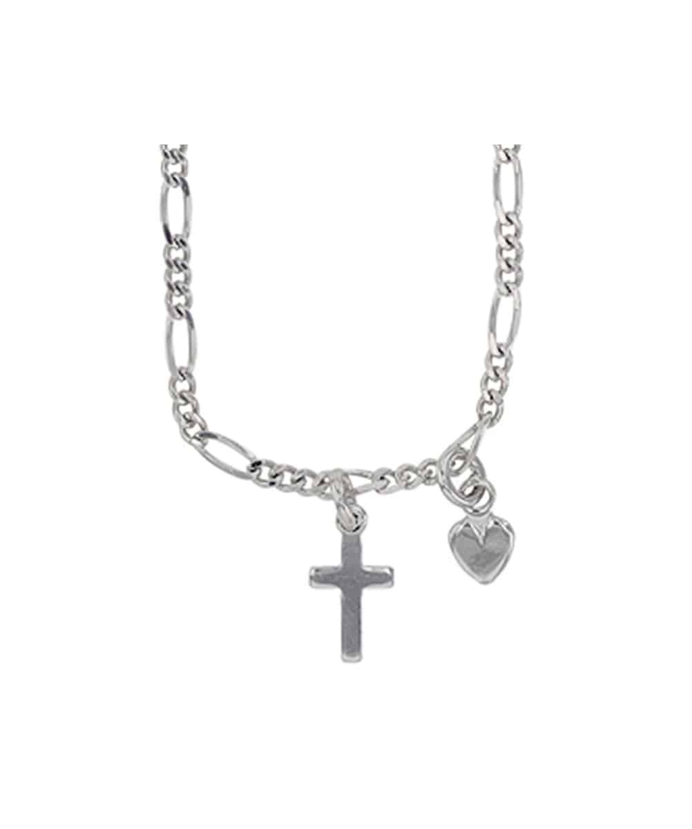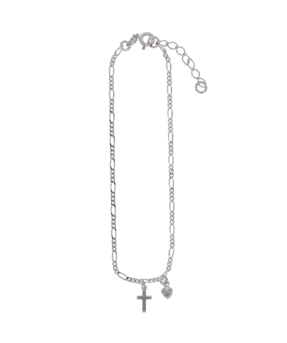 Bracelet chaîne de cheville Lex avec croix et coeur en argent 925/1000 rhodié.
