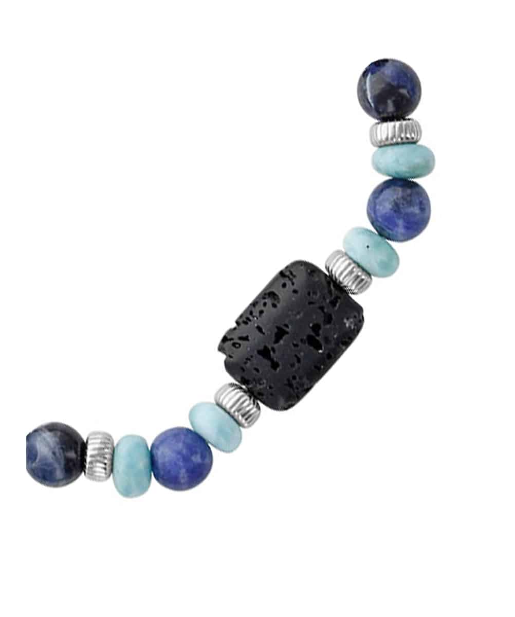 Le bracelet Luc élastique en larimar, sodalite et argent 925/1000 rhodié est un bijou stylé pour homme. Il est de couleur bleu ou turquoise.