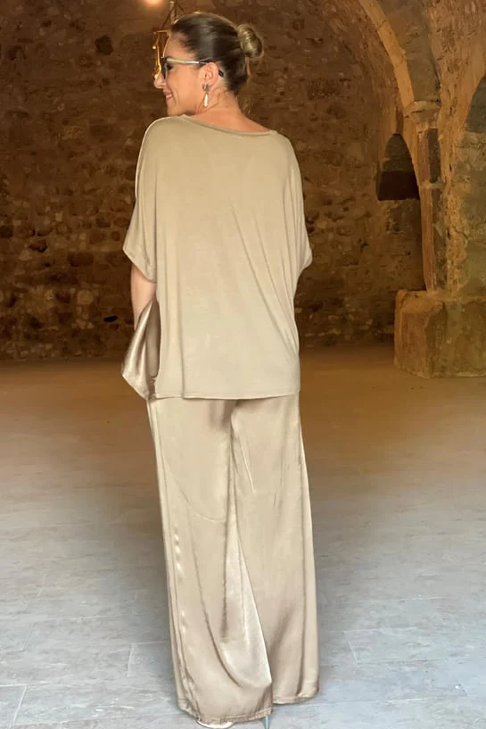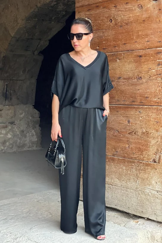 - Coupe décontractée – La blouse et le pantalon en satin offrent une coupe souple et décontractée, alliant confort et élégance.
