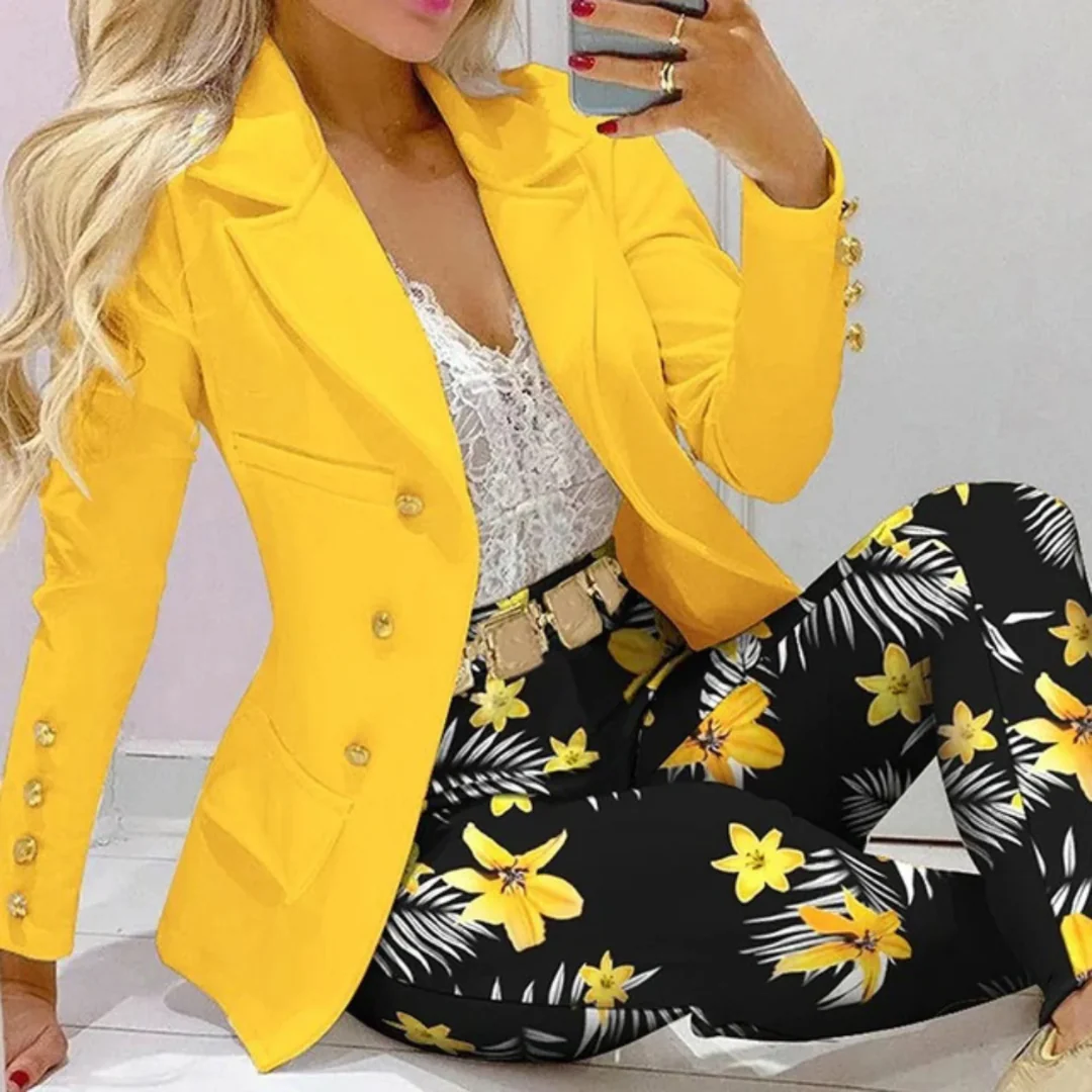 - Blazer et pantalon de coupe ajustée : Crée une silhouette élégante et sophistiquée.