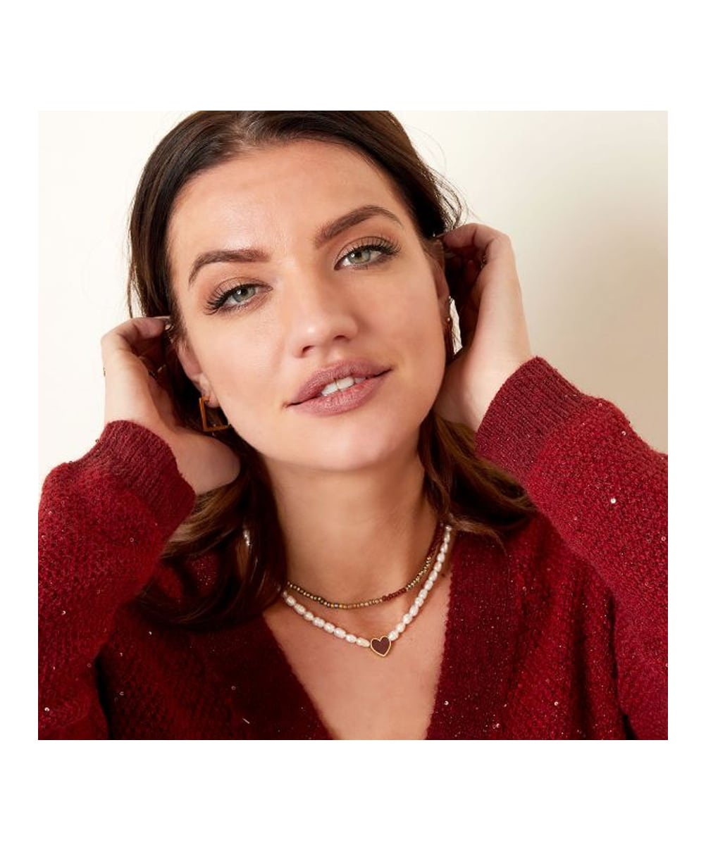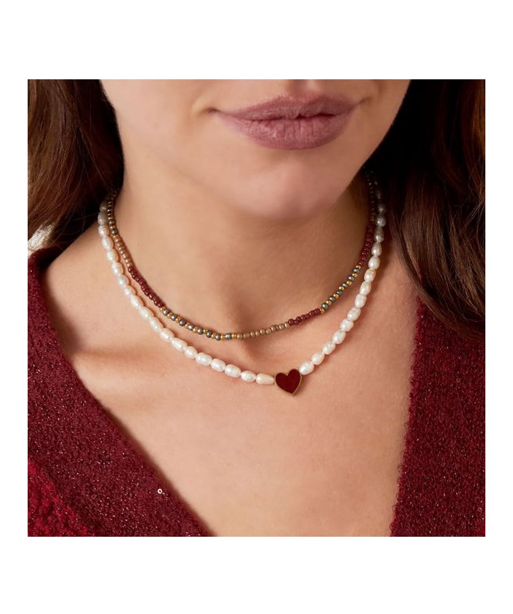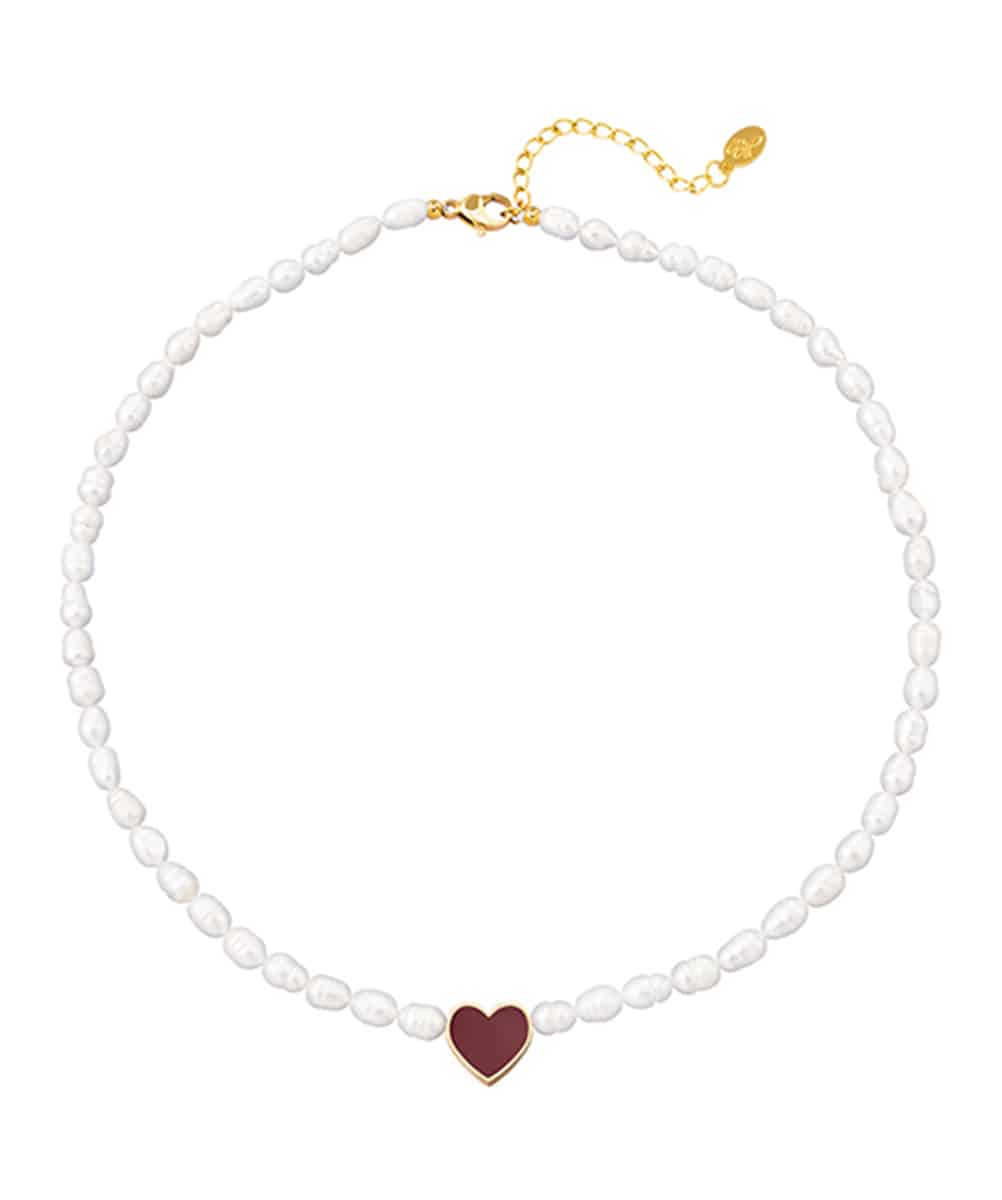 Collier avec des perles et une breloque en forme de coeur. Le collier est disponible dans les couleurs vert, beige et bordeaux. Jolie à combiner avec le bracelet similaire.