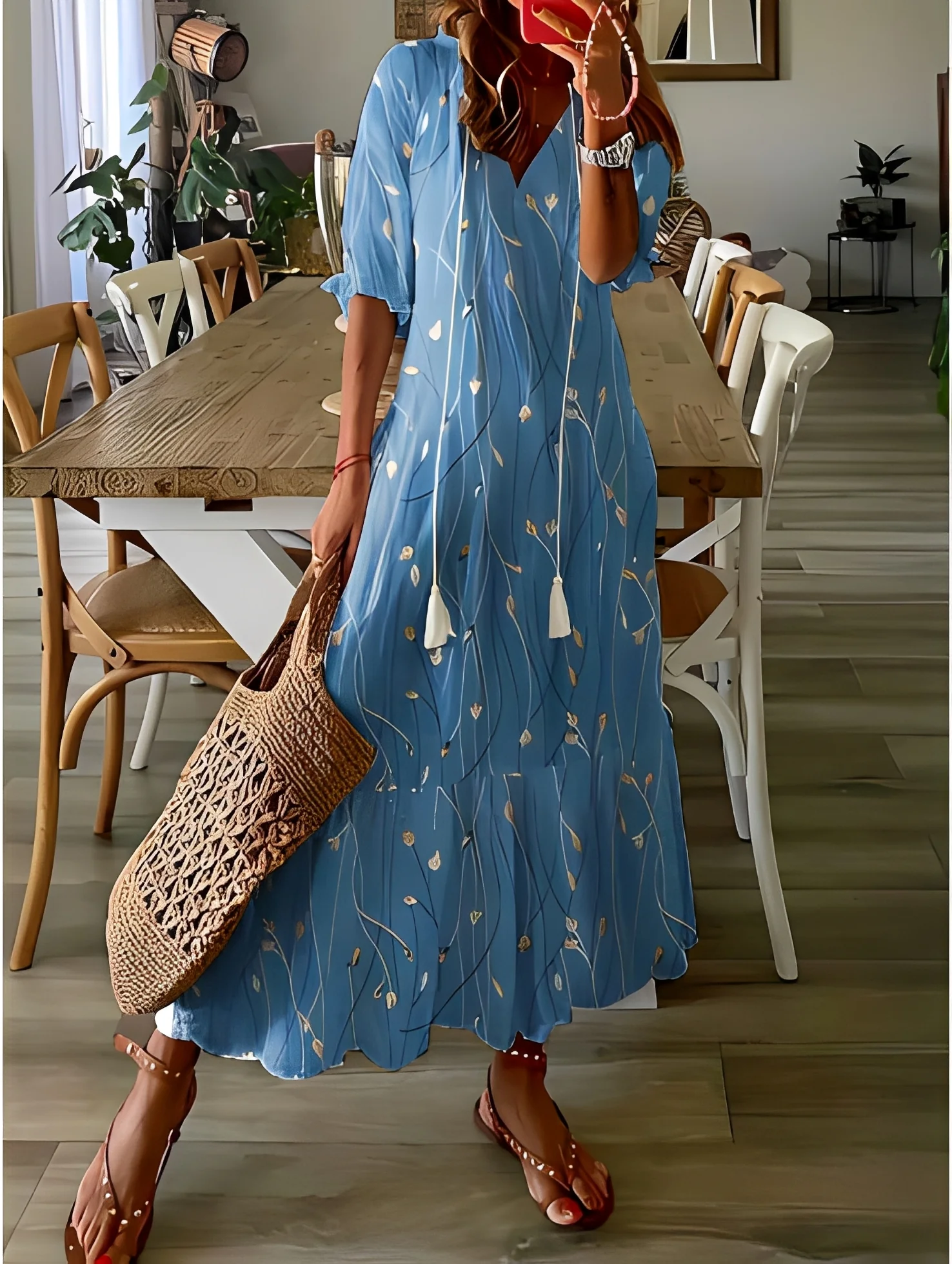 Découvrez le véritable charme de cette élégante robe longue bohème confectionnée dans un tissu doux et respirant qui vous garantit un confort optimal tout au long de la journée. Son encolure en V romantique et sa silhouette gracieuse lui confèrent une touche féminine et libre, parfaite pour les sorties décontractées comme pour les occasions spéciales. Avec son drapé fluide et sa texture légère, elle met en valeur toutes les morphologies. Son style décontracté mais raffiné en fait un choix idéal pour celles qui aiment la mode bohème chic avec une touche de sophistication. Associez-la à des sandales pour un look décontracté ou habillez-la avec des talons et des accessoires pour une soirée.