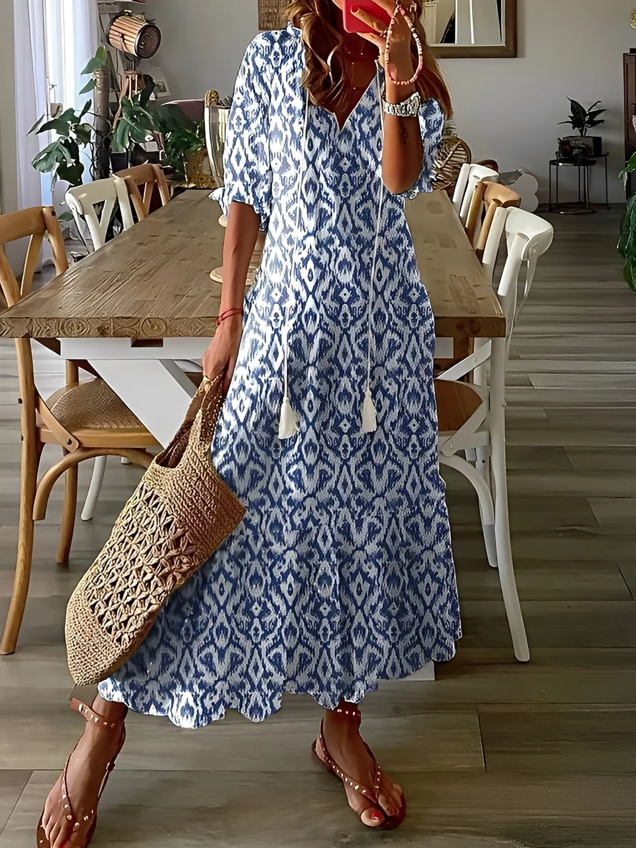 - Silhouette bohème flatteuse : la coupe fluide et le col en V accentuent délicatement votre silhouette naturelle sans être trop moulante.