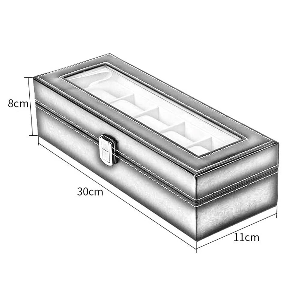 Elle contient 6 coussins en velour synthétique pouvant accueillir les montres de tout diamètre. La structure extérieure est recouverte de cuir synthétique qui lui confère un look résolument moderne, incluant une fermeture par clip métallique.