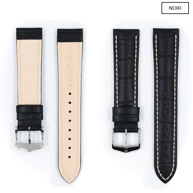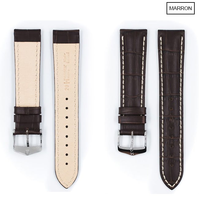 Pour les modèles de bracelet de cette série, le relief naturel à écailles rectangulaires d‘un alligator de Louisiane est reporté sur du cuir de veau le plus fin à l‘aide d‘un processus d‘embossage spécial. Le contraste de couleur entre l‘écaille et l‘entre-écailles reproduit fidèlement le grain caractéristique de l‘alligator. HIRSCH Alligator embossed existe également pour les fans de sport aquatique en version 100 m Water-Resistant !