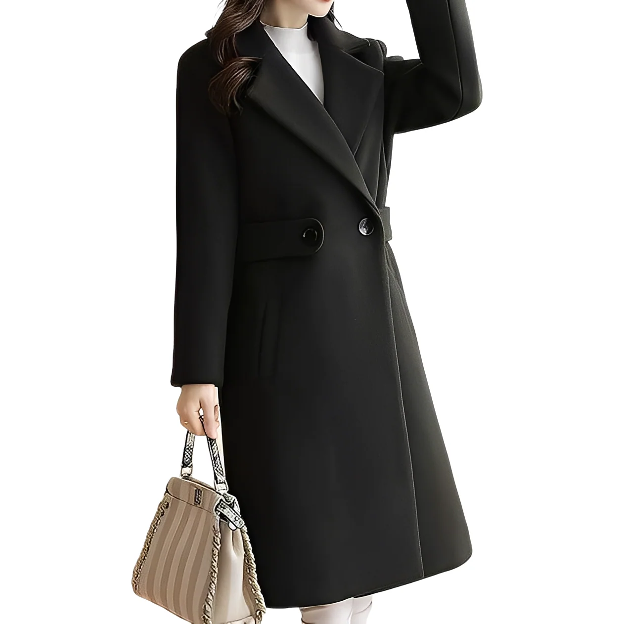 Ce manteau en laine se distingue par sa coupe classique qui tombe au-dessus du genou et sa ceinture élégante mettant en valeur la silhouette. Le tissu de haute qualité offre une chaleur agréable pendant les journées fraîches, et son design intemporel est polyvalent – idéal pour le bureau, une sortie en ville ou des événements festifs. Ce manteau conjugue style, confort et praticité de manière harmonieuse.
