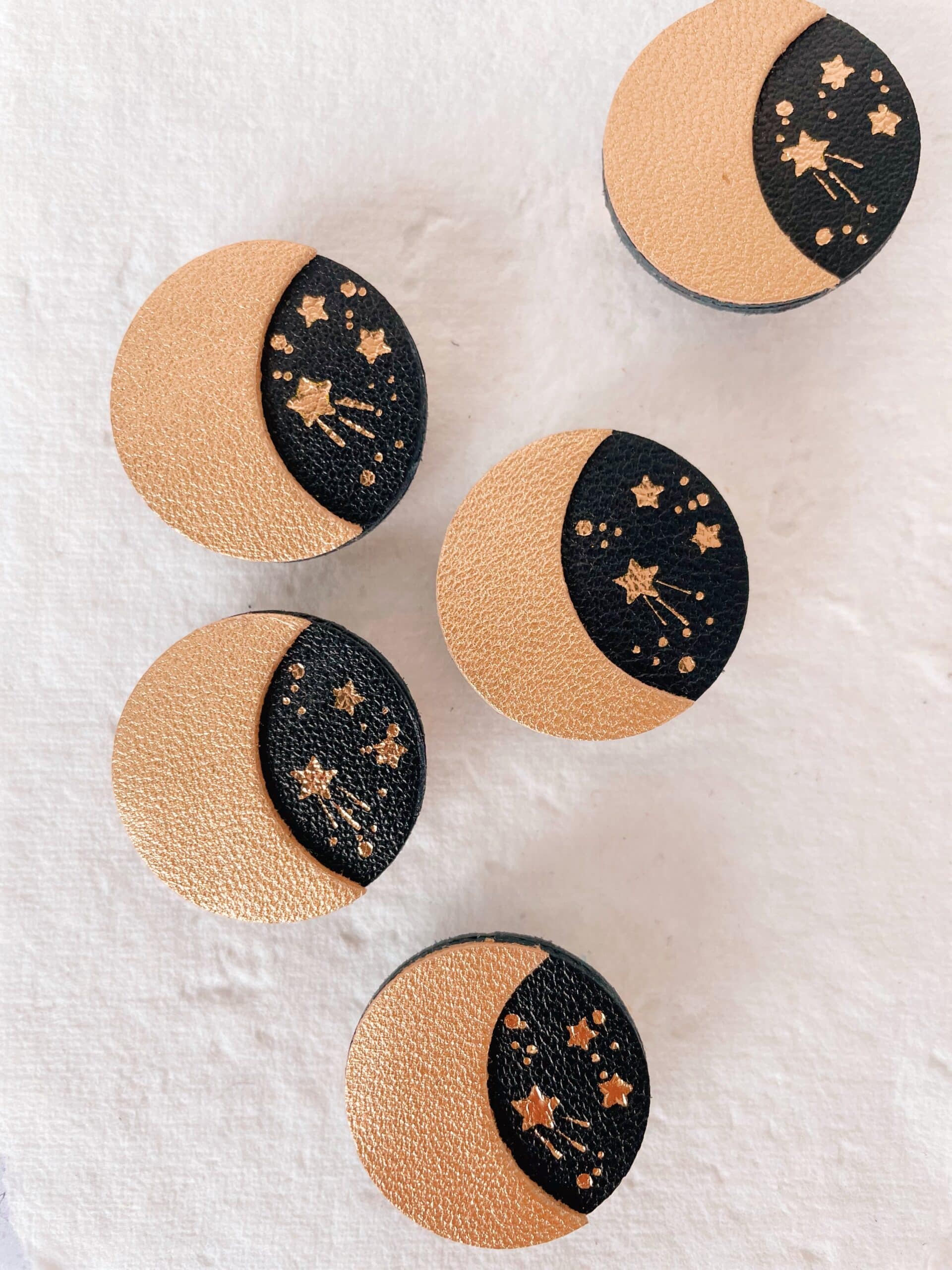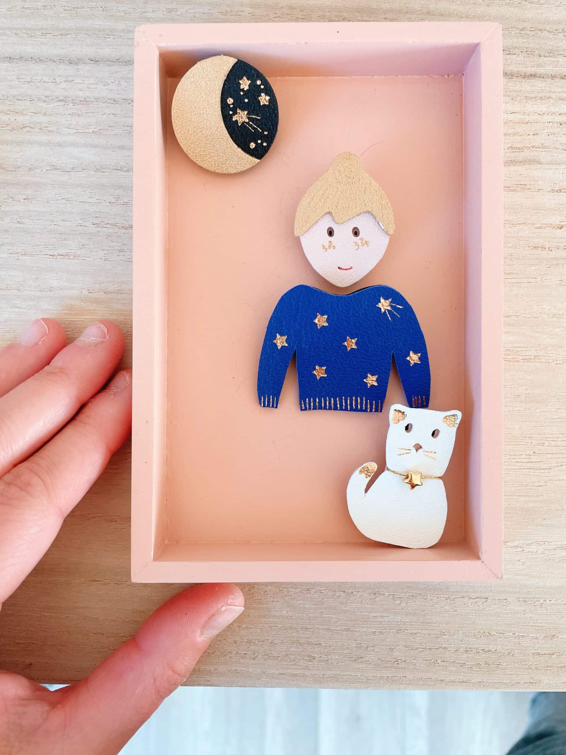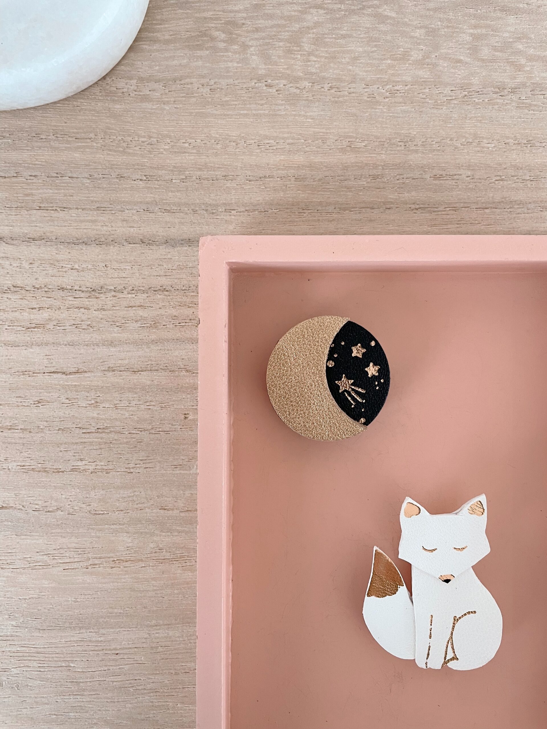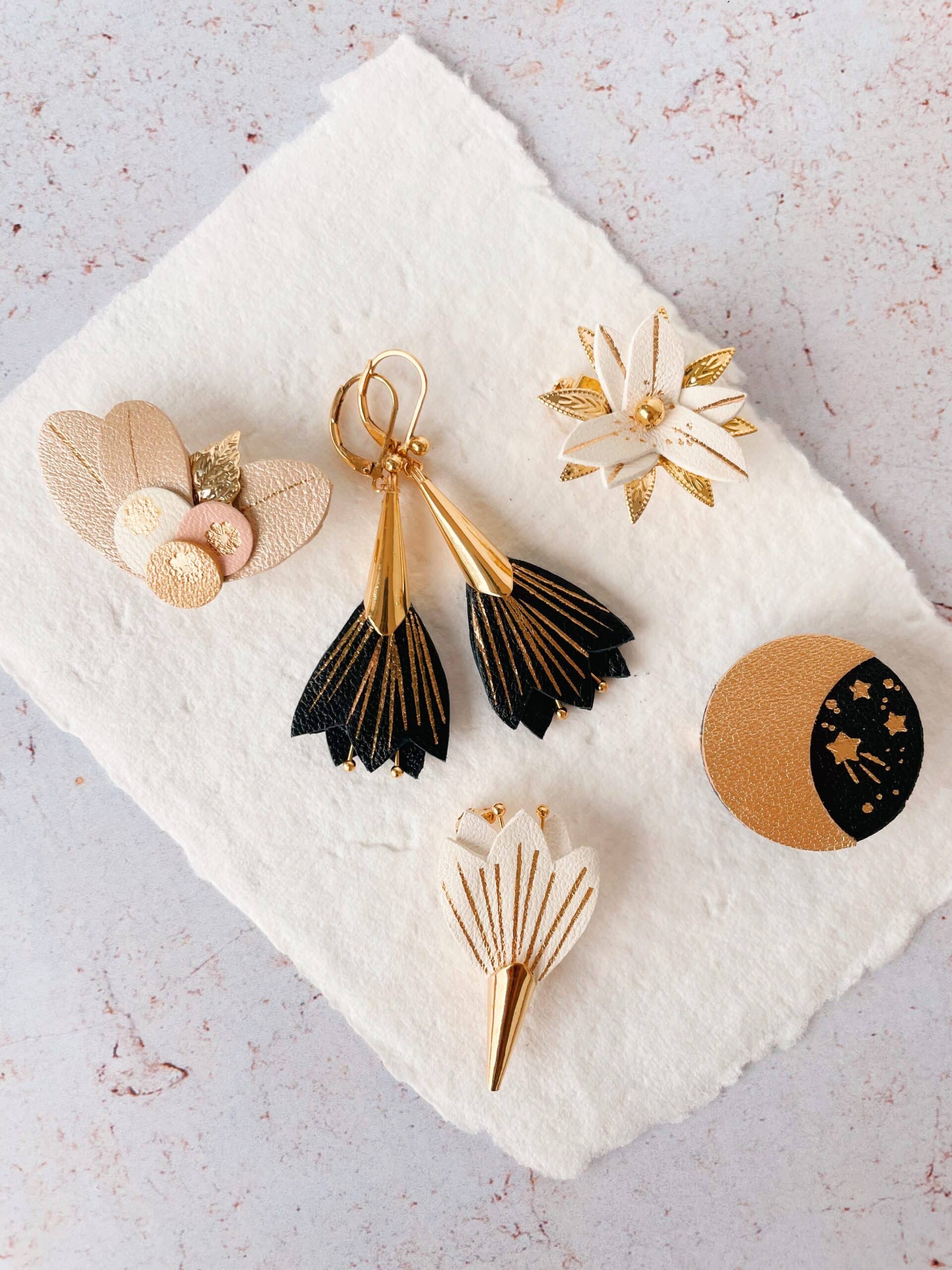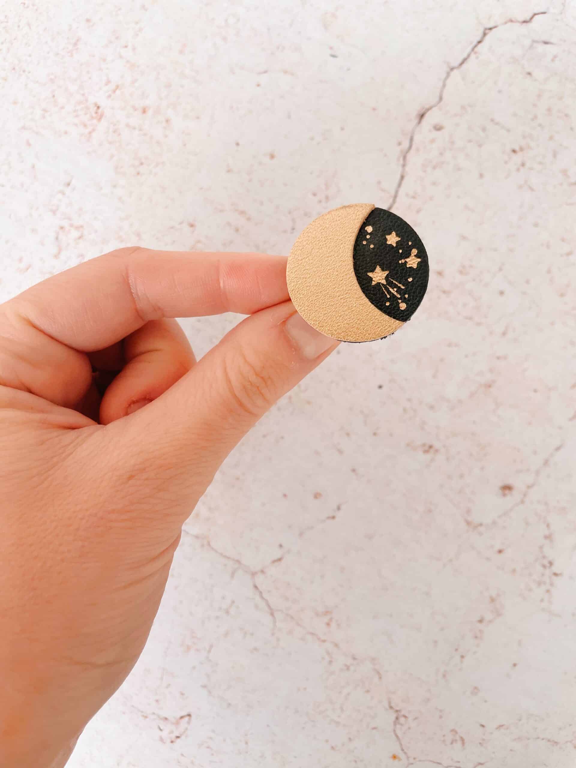 Cette jolie broche céleste, aussi appelée Douce Nuit, est intemporelle car elle fait partie des symboles astrologiques, du féminin sacré et aussi des cycles de la nature. Avec ses détails dorés à chaud à l’or véritable c’est un ravissant bijou cosmique en cuir surcyclé. Elle est confectionnée de façon artisanale par mes soins dans mon atelier sur la terre des 2 caps (côte d’opale en France). Chaque croissant de lune est minutieusement découpé à la main et chaque voûte céleste est ensuite étoilée avec un procédé traditionnel de dorure à chaud. Chaque pièce est donc unique. Elle est réalisée à partir d’excédents et coupons de cuir dans une démarche responsable de valorisation des matières premières (upcycling). Il s’agit de cuir d’ovins de provenance française. Le fermoir en laiton est doré à l’or fin à Paris, le fourreau et les étamines fabriqués en Europe. Comme il s’agit de chutes de cuir, les coloris peuvent varier légèrement.