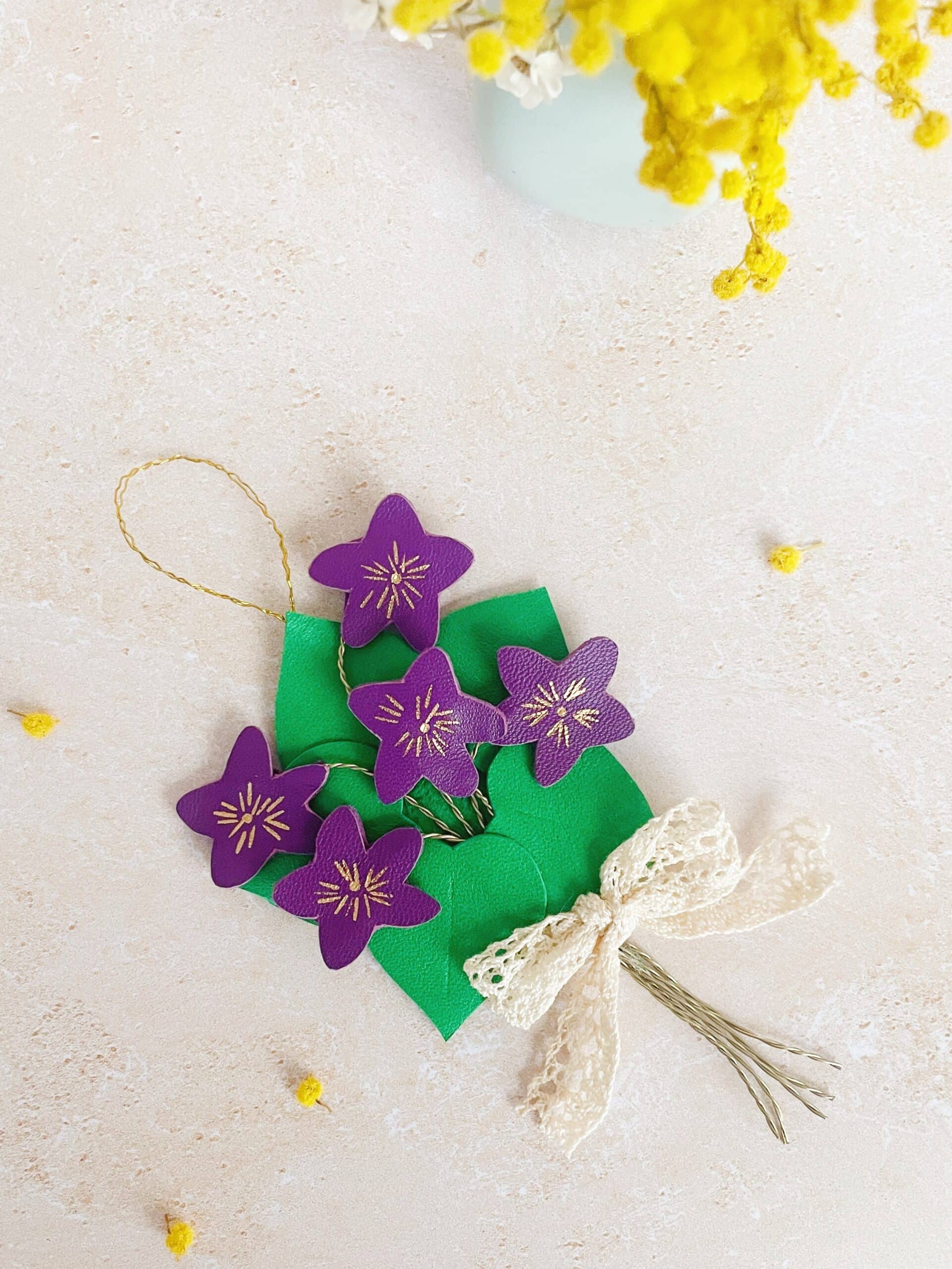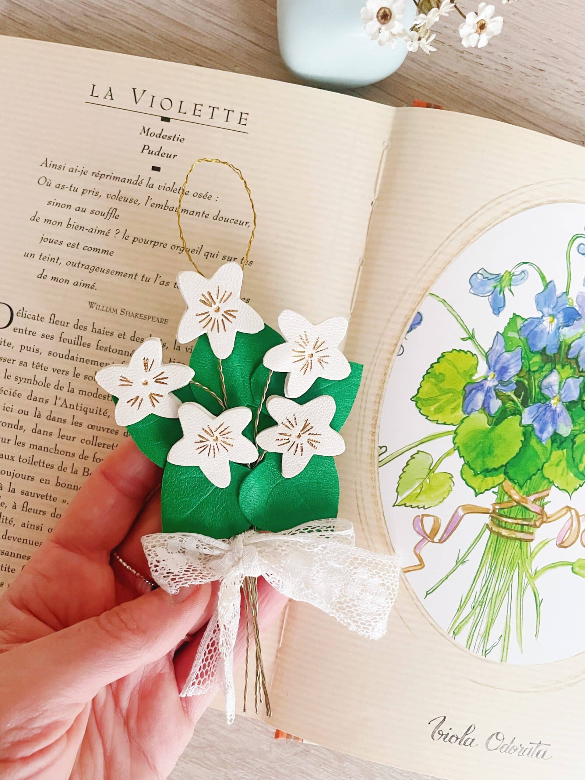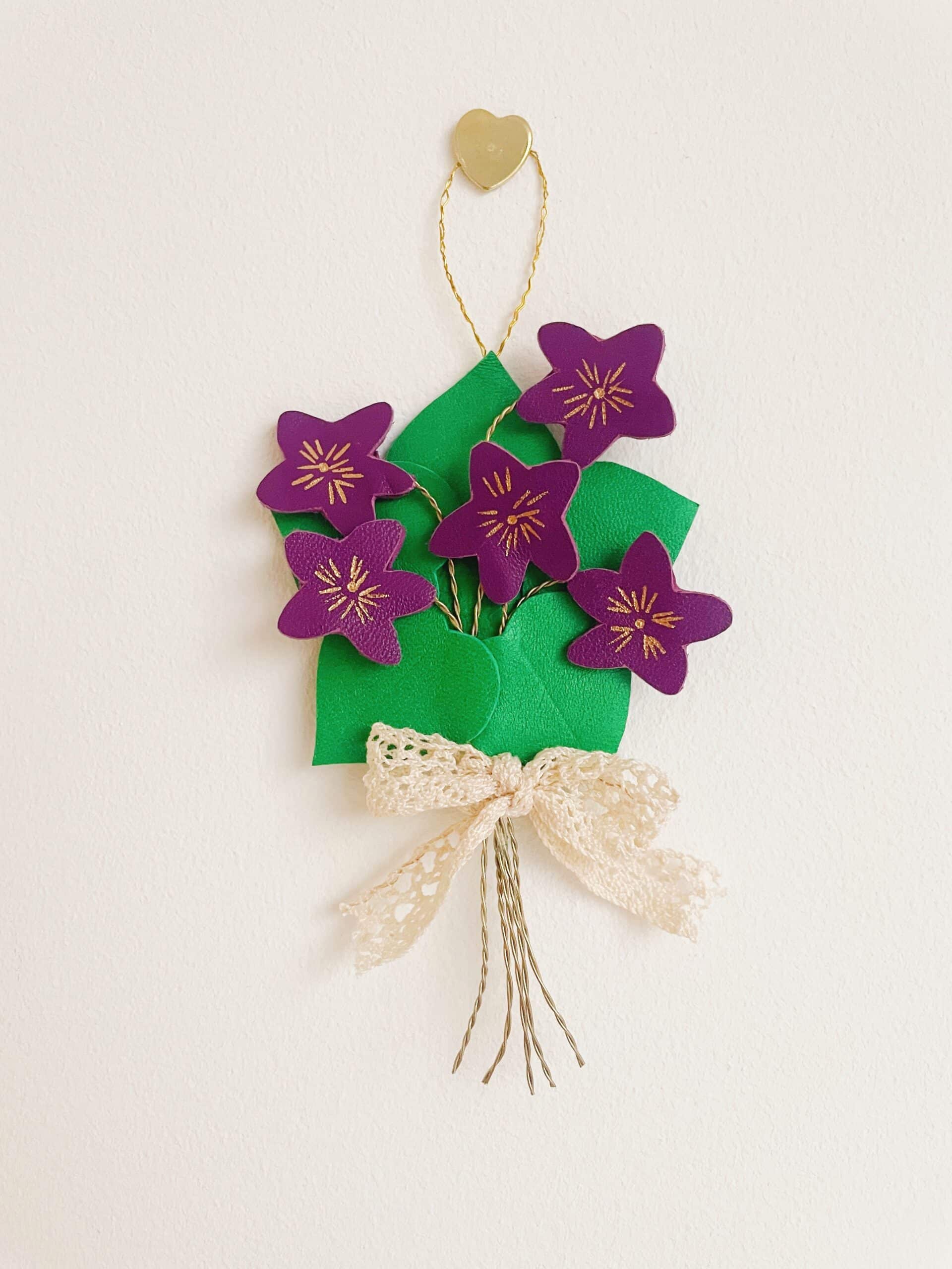 Ce charmant bouquet de violettes au style vintage, délicieusement rétro chic, ne fane jamais. Elégant et robuste, il est composé de fleurs violettes ou blanches entourée de leurs feuilles vertes façonnées en cuir surcyclé (revalorisation d’excédents de tannerie dans une démarche responsable d’utilisation des matières premières, “upcycling”). Durable et légère, chaque bouquet est minutieusement découpé main à partir de gabarits exclusifs. Pour plus de préciosité et de raffinement, les pétales et les coeurs de fleurs sont rehaussés de jolis détails (marquage à froid et dorure à chaud à l’or véritable). Ces spécimens éclosent dans mon atelier d’artisan métier d’art sur la terre des 2 caps (Côte d’opale en France). Chacune de ces bouquets de fleurs est unique. Les violettes et leur feuillage sont réalisées à partir de cuir d’ovins de provenance française et européennes. Les tiges sont façonnées en laiton et rassemblées par un ravissant ruban de véritable dentelle ancienne chinée avec amour. Comme il s’agit de chutes de cuir et de mercerie ancienne, il peut y avoir des petites variations selon les morceaux utilisés.