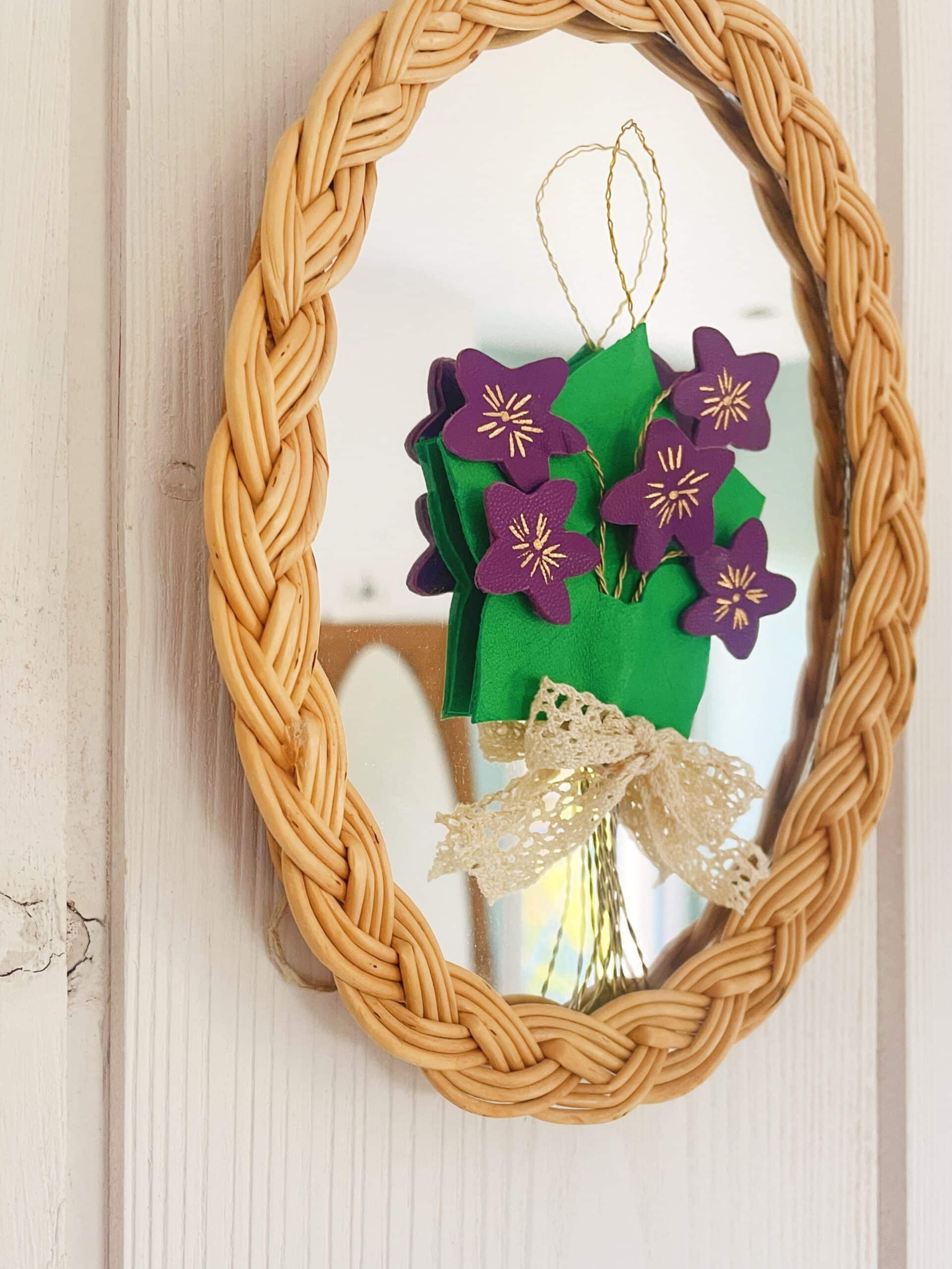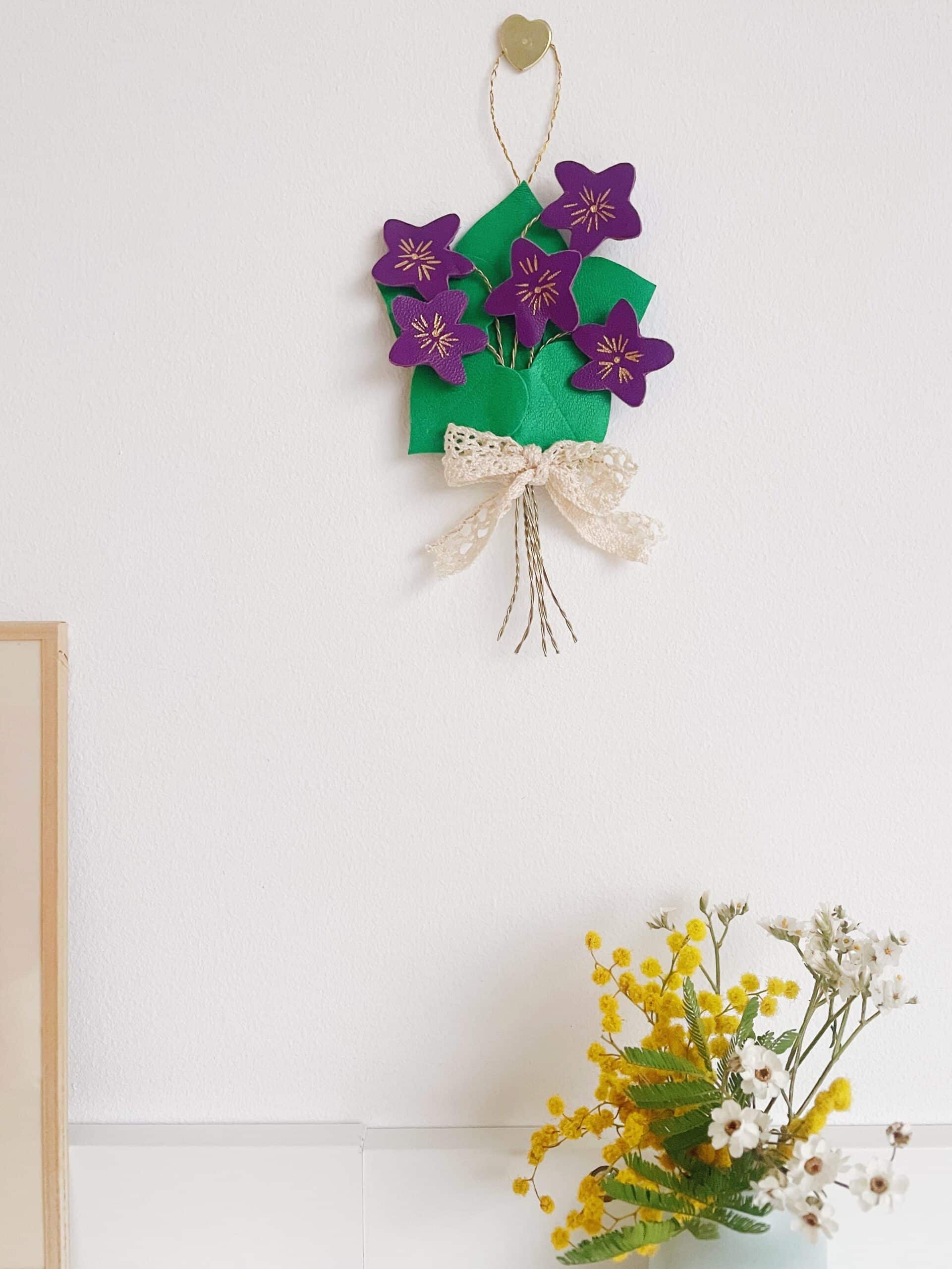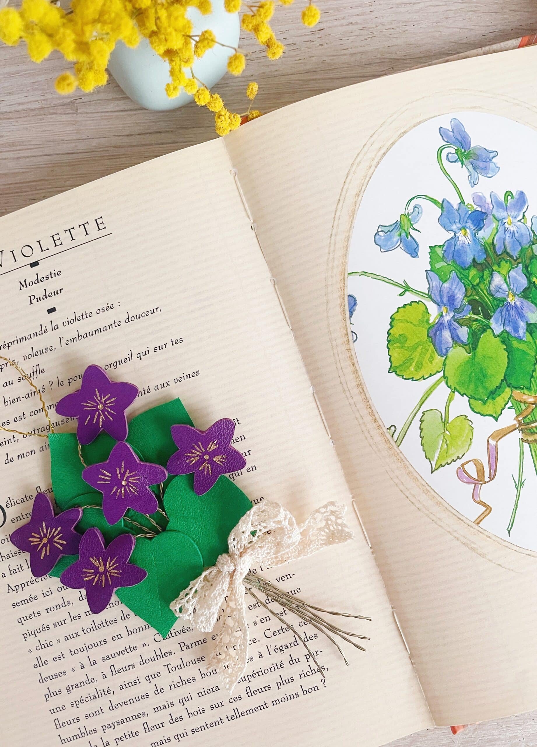Ce charmant bouquet de violettes au style vintage, délicieusement rétro chic, ne fane jamais. Elégant et robuste, il est composé de fleurs violettes ou blanches entourée de leurs feuilles vertes façonnées en cuir surcyclé (revalorisation d’excédents de tannerie dans une démarche responsable d’utilisation des matières premières, “upcycling”). Durable et légère, chaque bouquet est minutieusement découpé main à partir de gabarits exclusifs. Pour plus de préciosité et de raffinement, les pétales et les coeurs de fleurs sont rehaussés de jolis détails (marquage à froid et dorure à chaud à l’or véritable). Ces spécimens éclosent dans mon atelier d’artisan métier d’art sur la terre des 2 caps (Côte d’opale en France). Chacune de ces bouquets de fleurs est unique. Les violettes et leur feuillage sont réalisées à partir de cuir d’ovins de provenance française et européennes. Les tiges sont façonnées en laiton et rassemblées par un ravissant ruban de véritable dentelle ancienne chinée avec amour. Comme il s’agit de chutes de cuir et de mercerie ancienne, il peut y avoir des petites variations selon les morceaux utilisés.