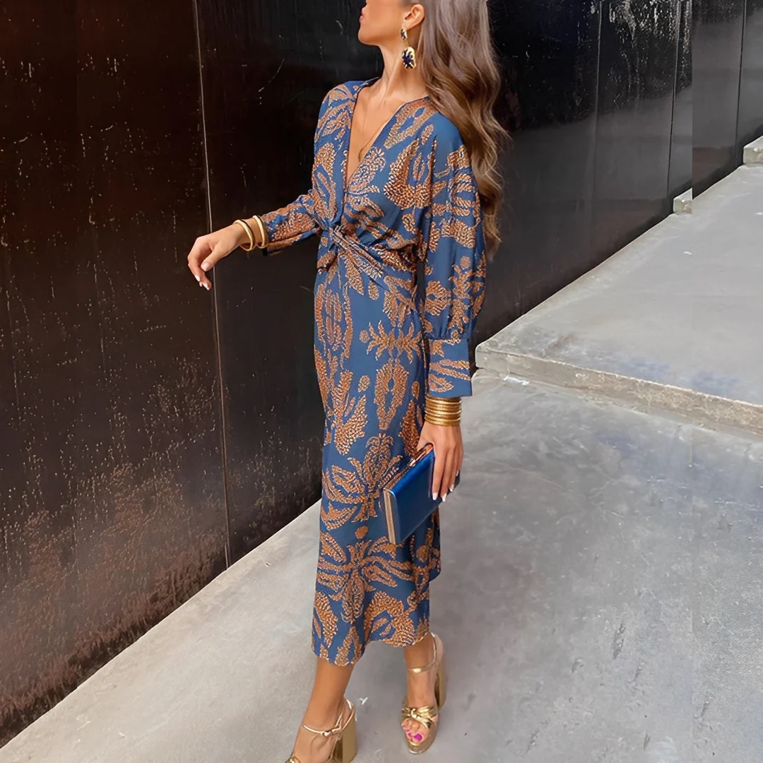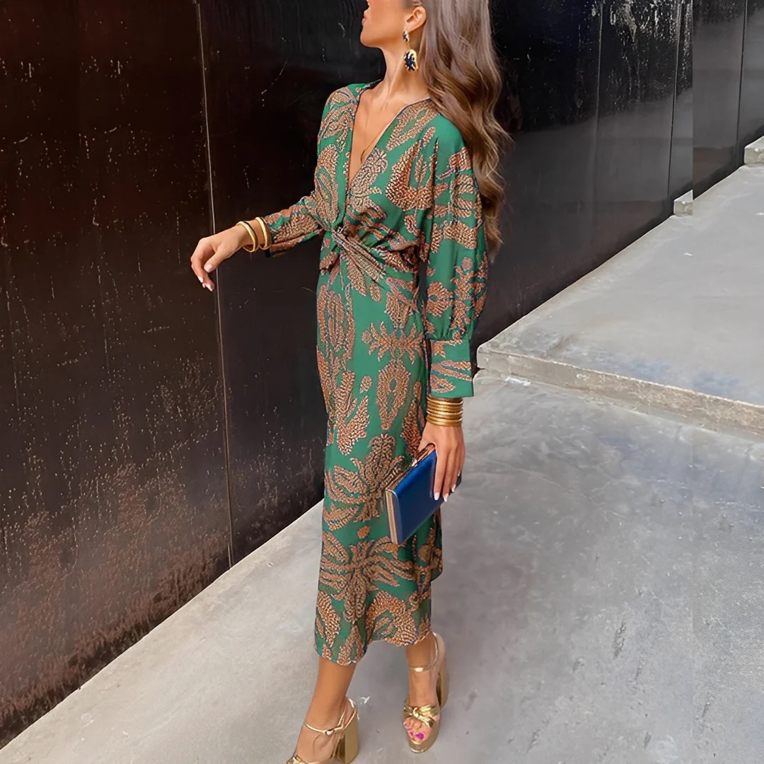 Faites de cette robe longue A-line à col en V votre pièce indispensable pour un style intemporel et une élégance naturelle à chaque événement.