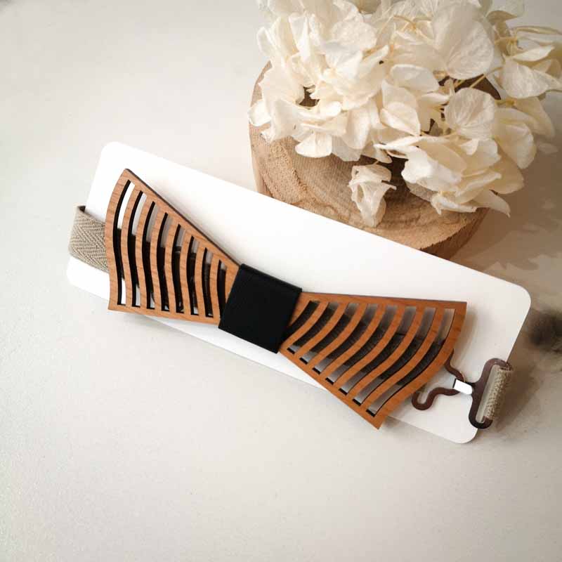 • Matériaux : bois de cerisier découpé et gravé au laser ; cuir revalorisé noir ; tour de cou en tissu beige