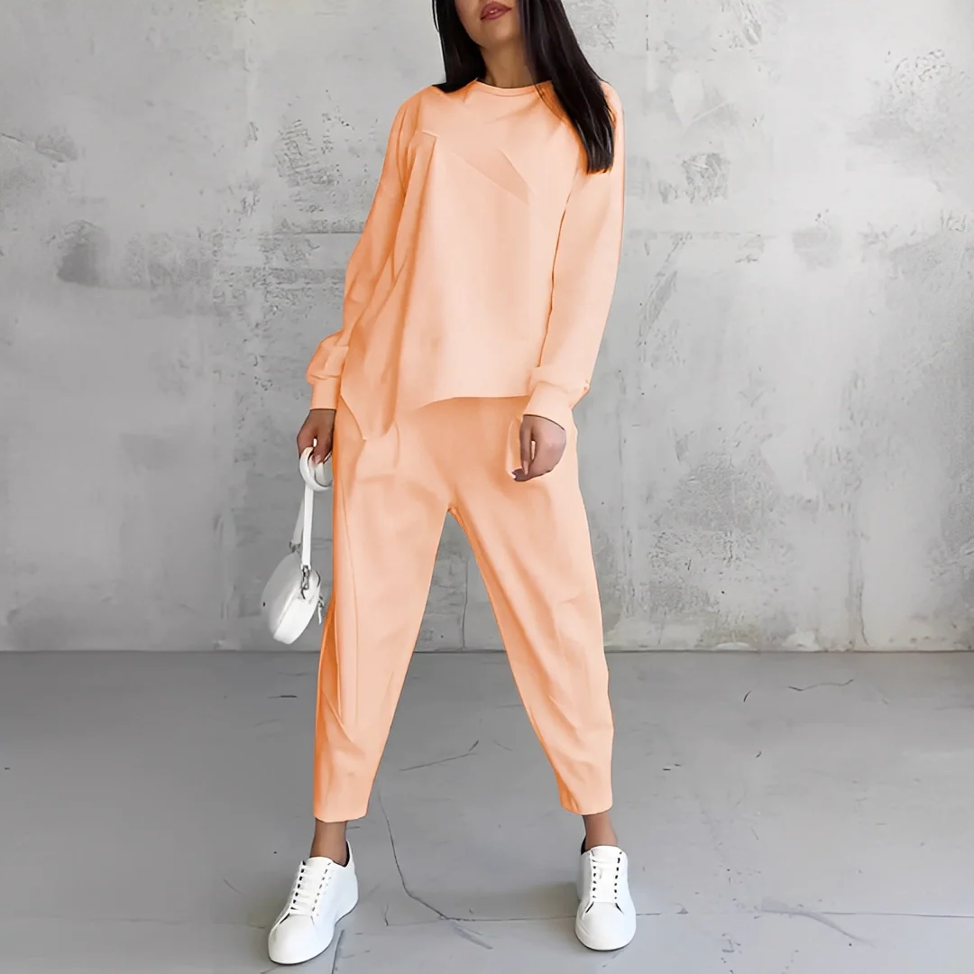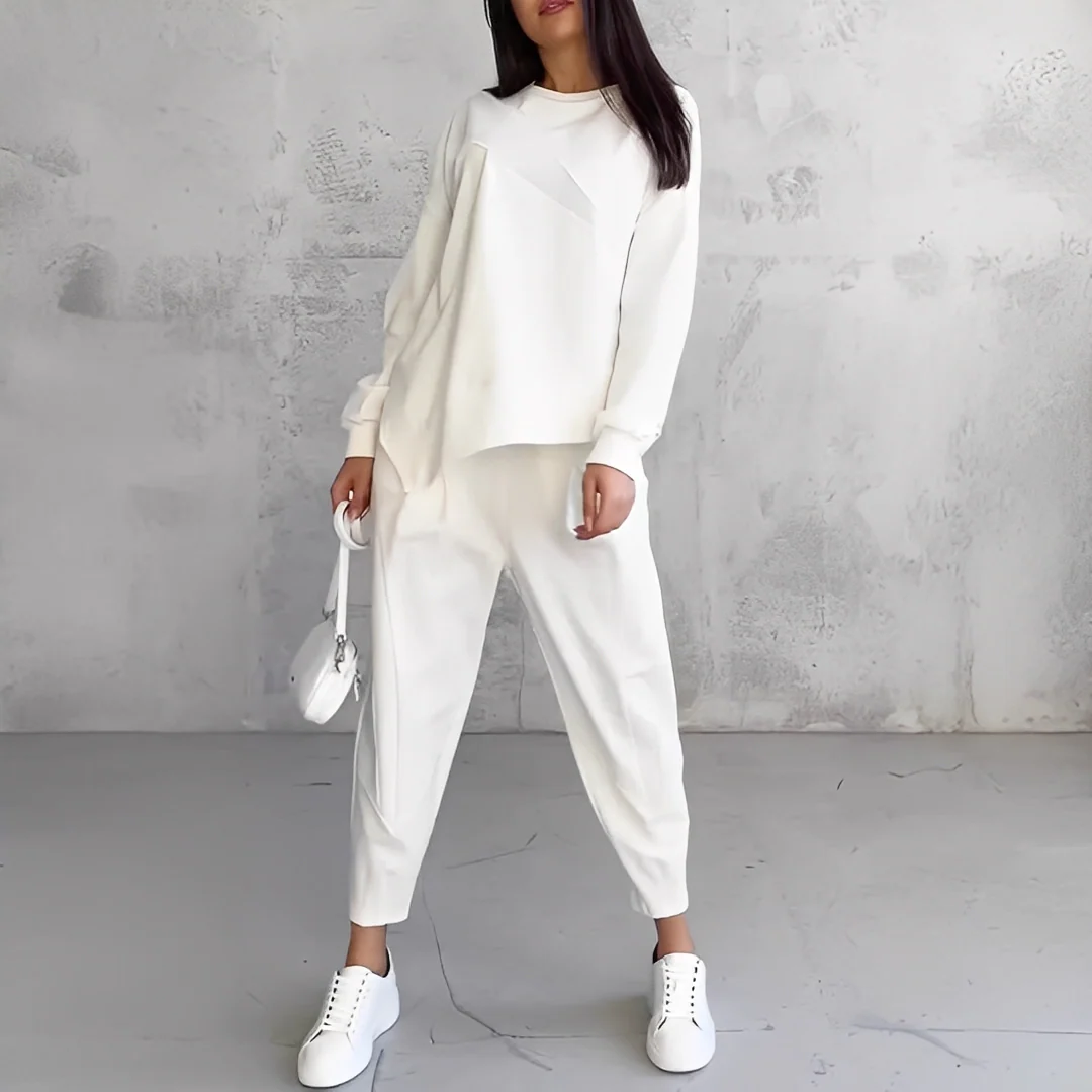 Découvrez l’ensemble deux pièces Mélisande pour femmes, composé d’un haut classique à col rond et manches longues et d’un pantalon assorti. Fabriqué dans un tissu mélangé de coton de haute qualité, cet ensemble allie durabilité et confort ultime. Son design décontracté mais élégant est parfait pour les sorties informelles, les journées de télétravail ou les loisirs du week-end. Disponible dans des couleurs polyvalentes telles que le blanc cassé, le gris et le noir, il est facile à assortir avec les essentiels de votre garde-robe. Son style intemporel vous garantit une allure soignée en toute occasion.