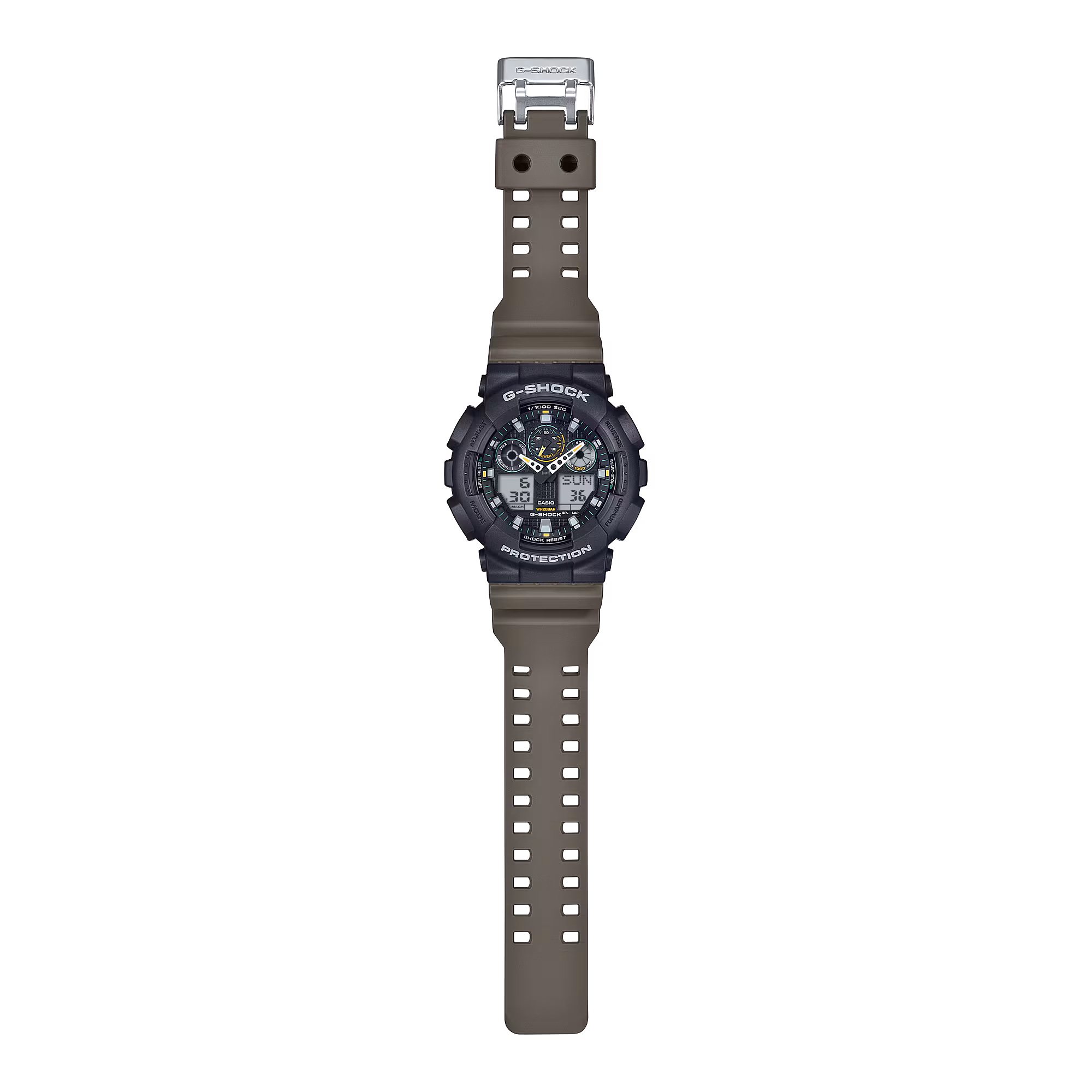 Deux écrans numériques rétroéclairés Super Illuminator prennent place à 4h et 8h : l’un pour le jour de la semaine et les secondes, l’autre pour la date et le mois. En complément, un compteur de chronométrage 1/1000e est situé à 12h et un autre à 2h pour la vitesse, avec une fenêtre circulaire à 10h qui affiche les fonctions actives comme l’alarme ou le snooze.