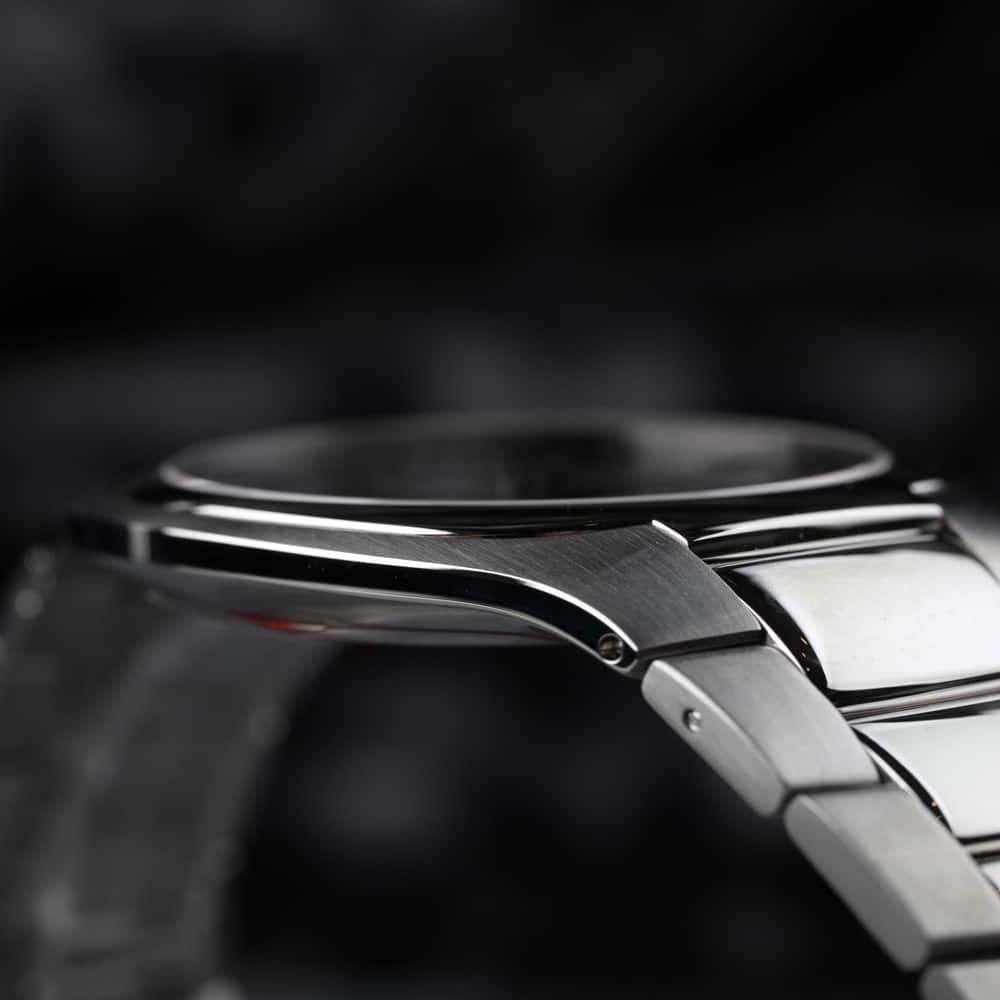 Le chic et l’élégant de cette montre proviennent probablement des couleurs utilisées avec bon goût. L’argenté du boitier vient ici contraster avec finesse le noir somptueux du cadran, ainsi que l’acier du bracelet. Le gris argenté utilisé pour le marquage permet enfin une grande lisibilité à la montre…