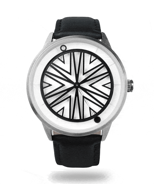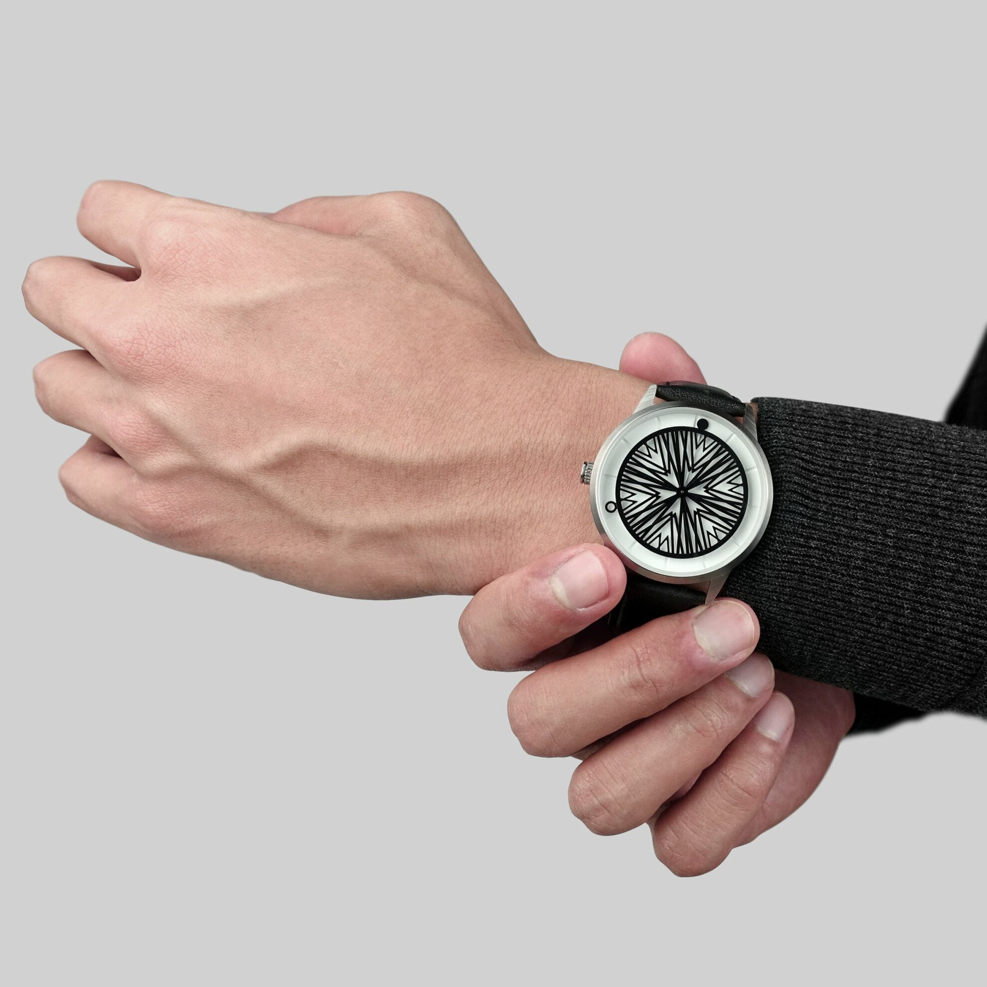 Peut-être notre design le plus ambitieux à ce jour, ce design vous attire et vous trouble. Une symétrie trompeuse crée l’illusion simultanée d’une expansion et d’une contraction. Le dessin revient brièvement à un équilibre, avant de recommencer son voyage. Nous sommes inspirés par la possibilité d’utiliser le mouvement du temps pour créer une beauté visuelle, et peut-être même une signification philosophique. Nous voulons créer des sculptures cinétiques pour votre poignet.