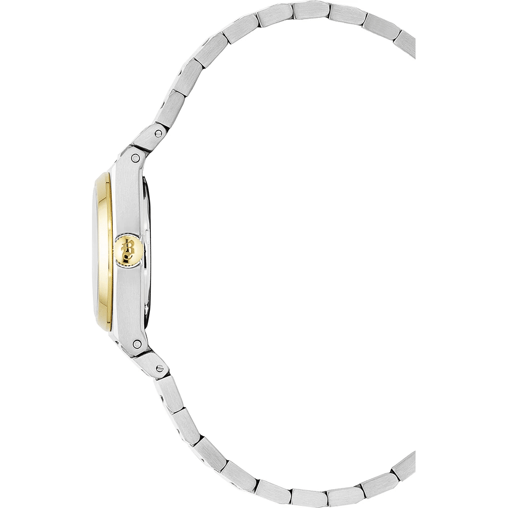Son boîtier rond de 25 mm en acier inoxydable, habillé d’une finition bicolore, épouse le poignet avec finesse et légèreté. Protégé par un verre minéral, le cadran conserve toute sa clarté au fil du temps. Le fond de boîtier vissé renforce la solidité de l’ensemble et assure une étanchéité de 5 bar, idéale pour une utilisation quotidienne, y compris sous la douche.