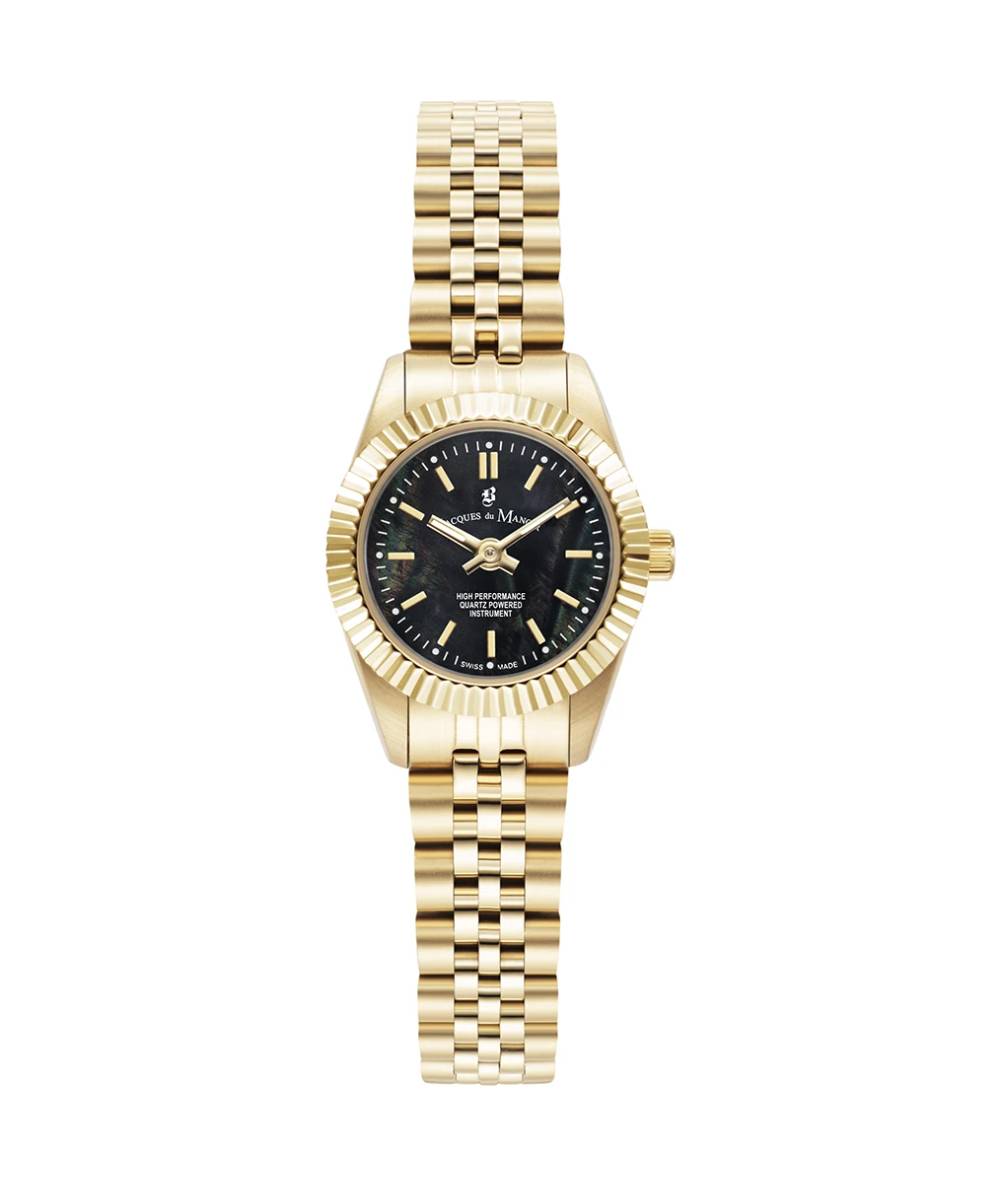 La Jacques du Manoir Inspiration 22 mm se distingue par l’élégance de son cadran noir profond, sublimé par des aiguilles couleur or qui offrent un contraste saisissant et raffiné. Pensée pour les amateurs de sobriété luxueuse, cette montre incarne un style intemporel, capable de traverser les tendances tout en conservant une allure résolument moderne.