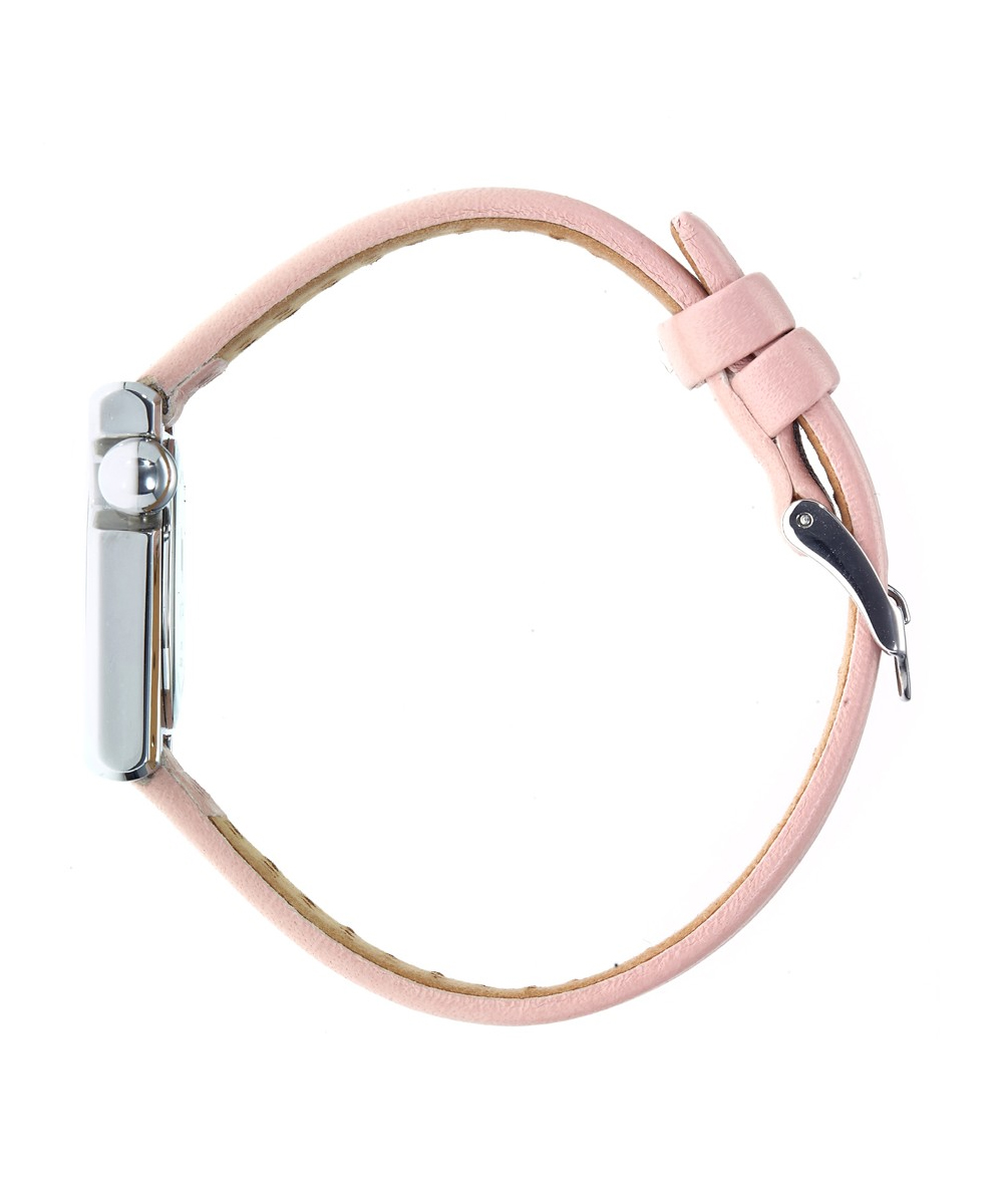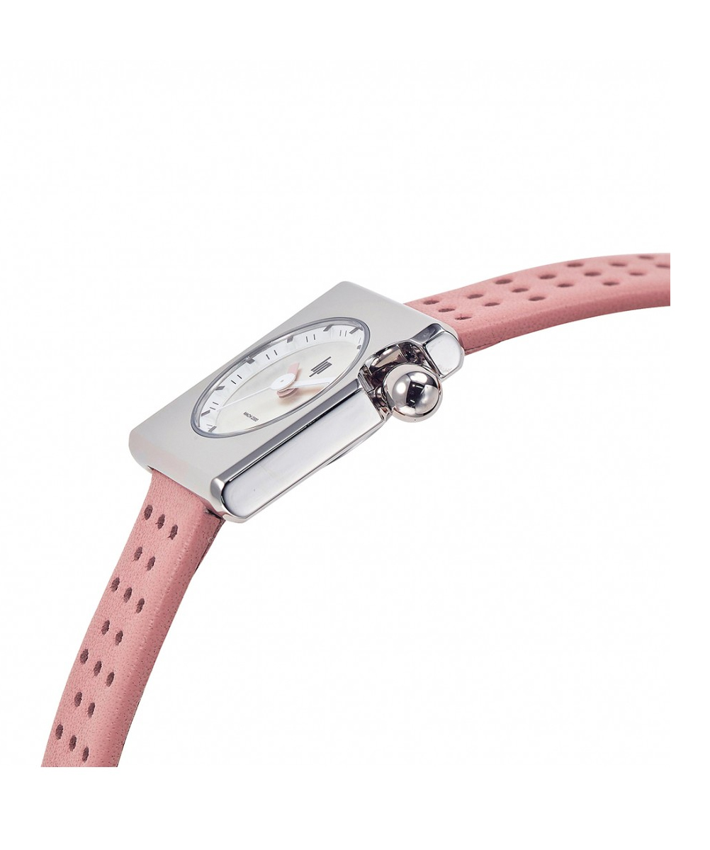Le cadran argenté est complété par une lunette intérieure grise avec des graduations noires, une aiguille des heures rose clair, une aiguille des minutes et une trotteuse blanches, et une couronne argentée. Le bracelet est en cuir véritable de bovin rose clair de 14 mm12. La montre est alimentée par un mouvement analogique à quartz Ronda 76312.