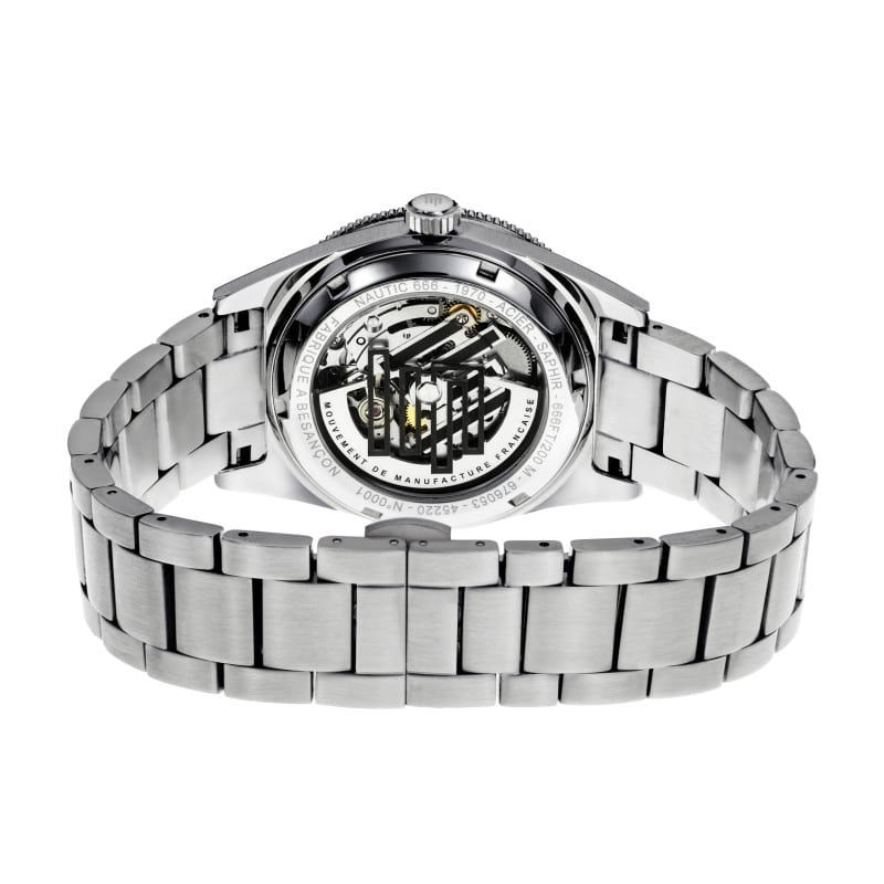 Pensée pour les aventuriers modernes, la Nautic 666 Manufacture assure une étanchéité de 20 bar (200 mètres), parfaite pour la plongée ou les activités nautiques. Son cadran gris sombre à la finition satinée accueille des aiguilles argentées luminescentes, assurant une lisibilité optimale, même dans les profondeurs. Le tout est complété par un bracelet en acier inoxydable à maillons brossés et polis, équipé d’une boucle papillon à boutons poussoirs pour un confort et une sécurité exemplaires.