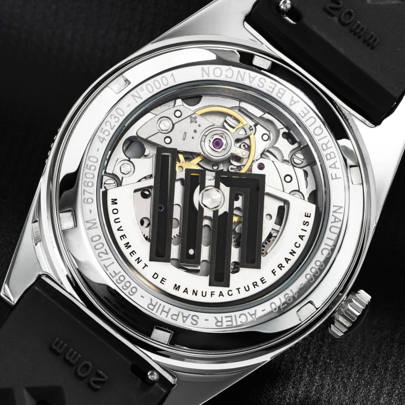 Conçue pour résister aux environnements les plus exigeants, la Nautic 666 est étanche jusqu’à 20 bar (200 mètres). Son boîtier en acier inoxydable de 39 mm et sa couronne vissée assurent une protection parfaite contre la pression et l’humidité. La lunette tournante unidirectionnelle en aluminium permet de mesurer le temps de plongée en toute sécurité, tandis que le verre saphir bombé avec double traitement antireflet garantit une lisibilité optimale, même dans les profondeurs.