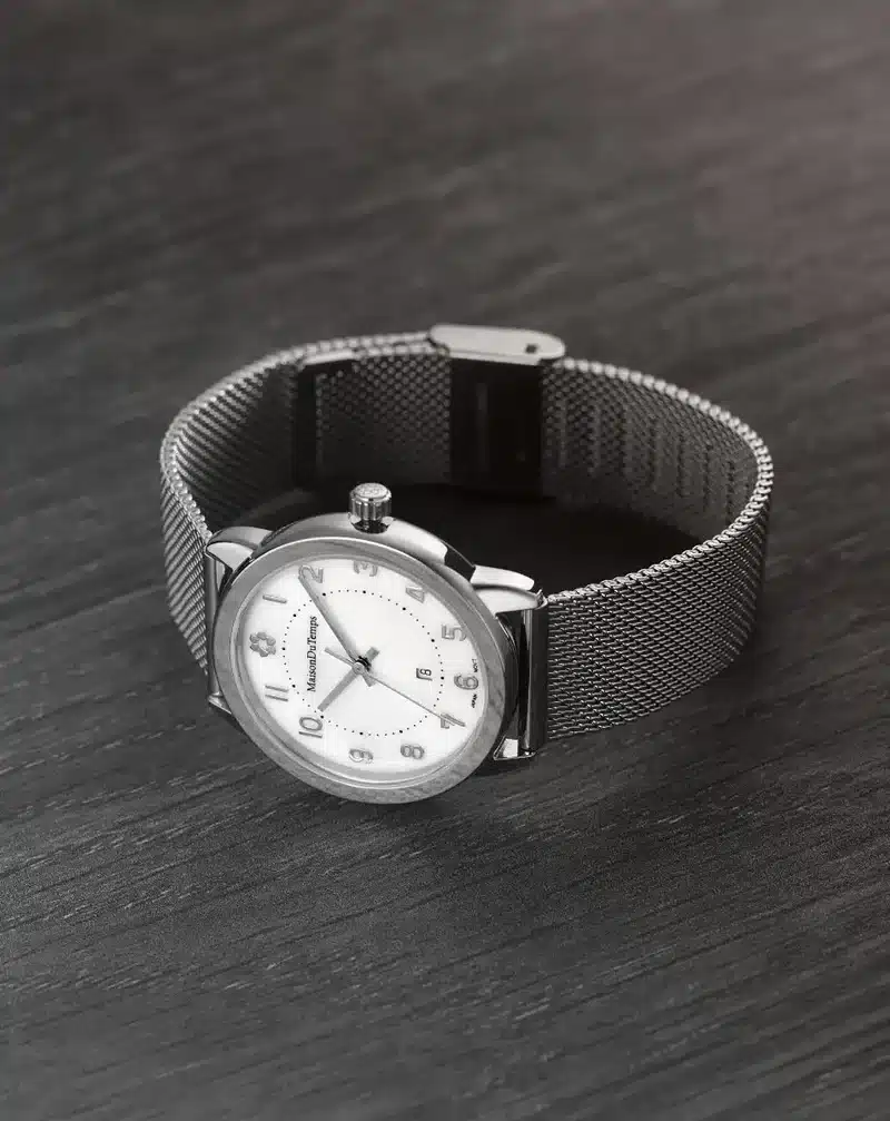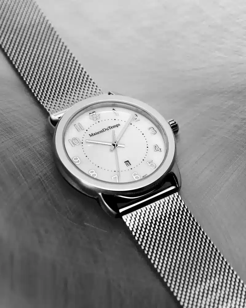Conçue pour durer, la MTMu Nacré Blanc associe un bracelet en acier robuste et un fermoir déployant pour un maintien sûr et confortable. Son étanchéité de 3 ATM protège la montre des éclaboussures du quotidien, tandis que son poids équilibré de 140 g assure une sensation de qualité à chaque mouvement. Élégante, précise et intemporelle, elle incarne l’essence du luxe au féminin signé Maison du Temps.
