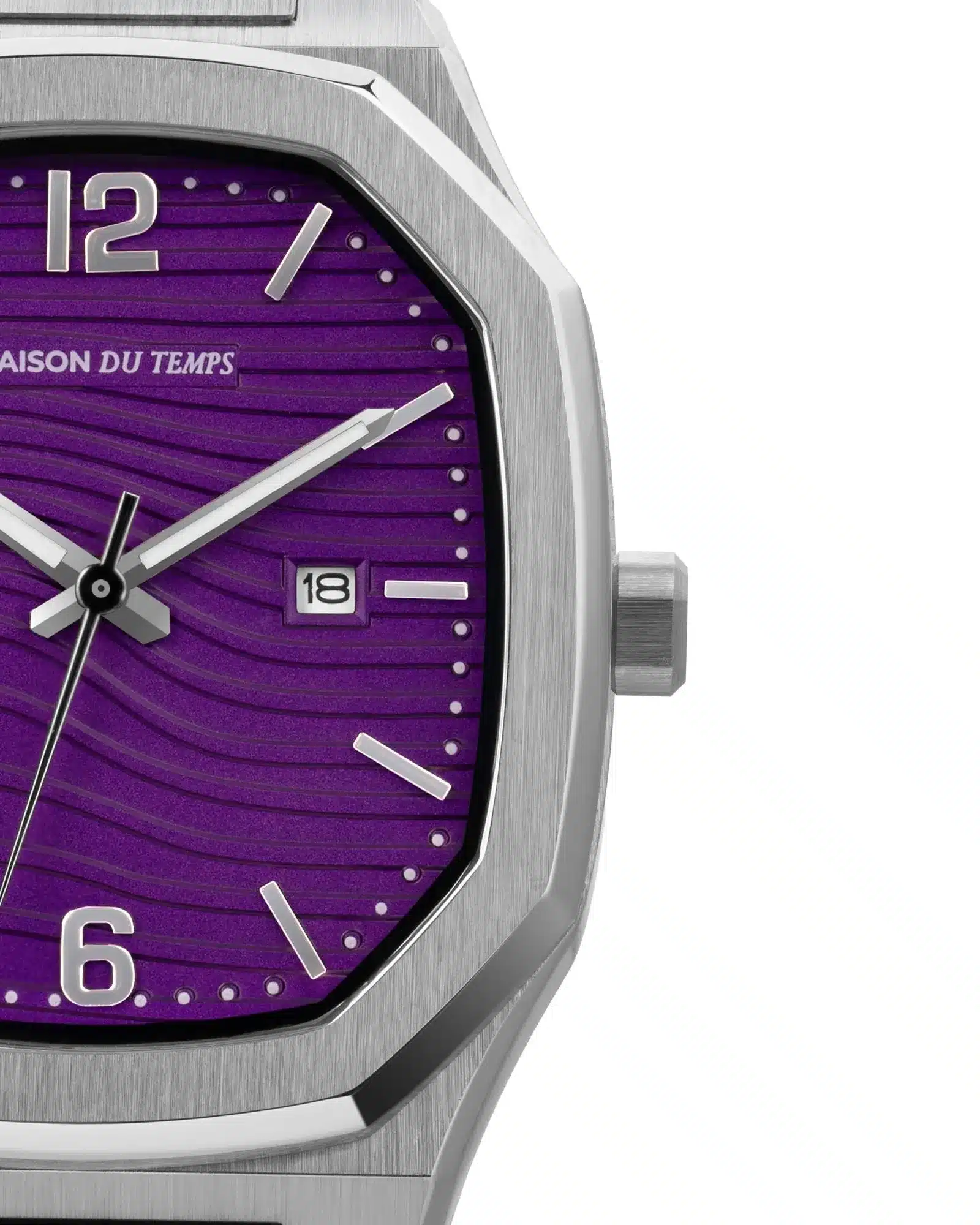 La Maison du Temps MTPhi Acier Violet séduit par son style moderne et sa teinte raffinée. Son boîtier de 34 mm en acier inoxydable 316L, à la finition brossée et polie, allie robustesse et sophistication. Le cadran violet, profond et envoûtant, confère à cette montre une personnalité unique — parfaite pour celles et ceux qui aiment affirmer leur élégance avec audace.