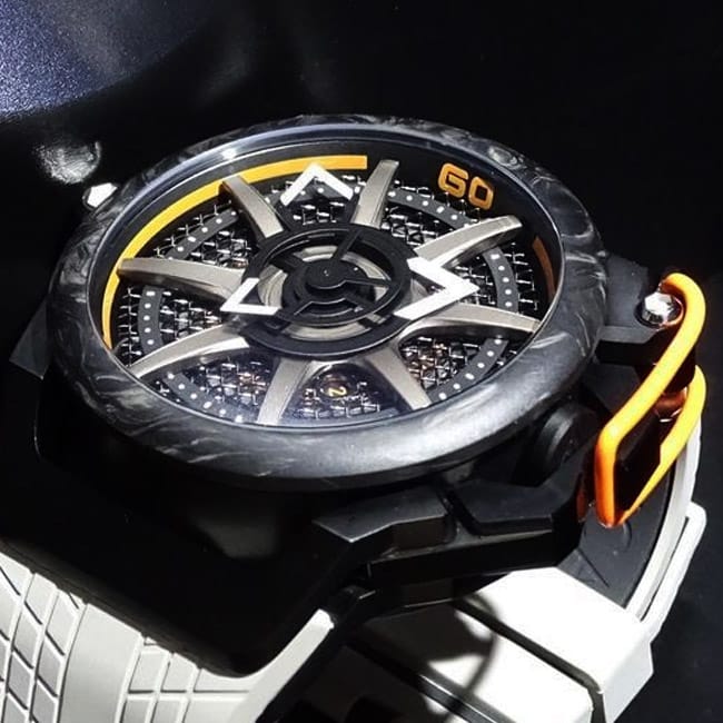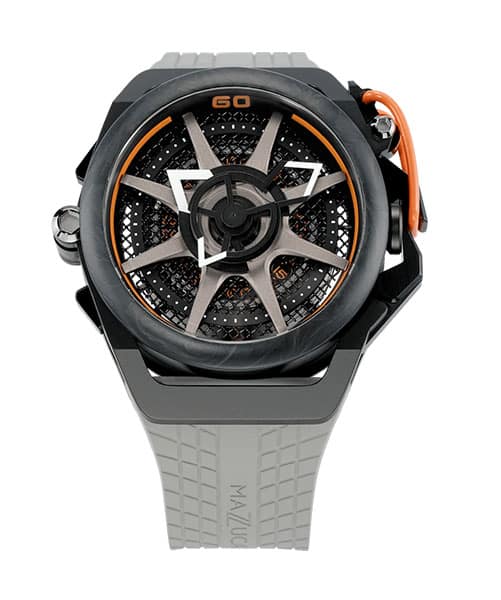Version affichage de l’heure, le cadran de la montre mazzucato RIM Monza est résolument inspiré d’une roue de voiture de course, avec jante et rayons.