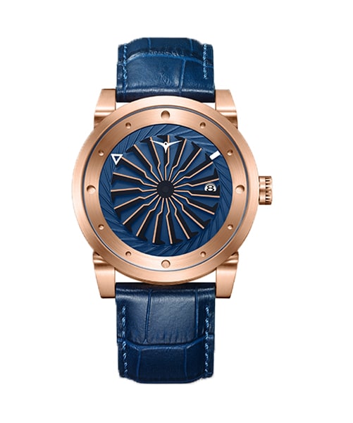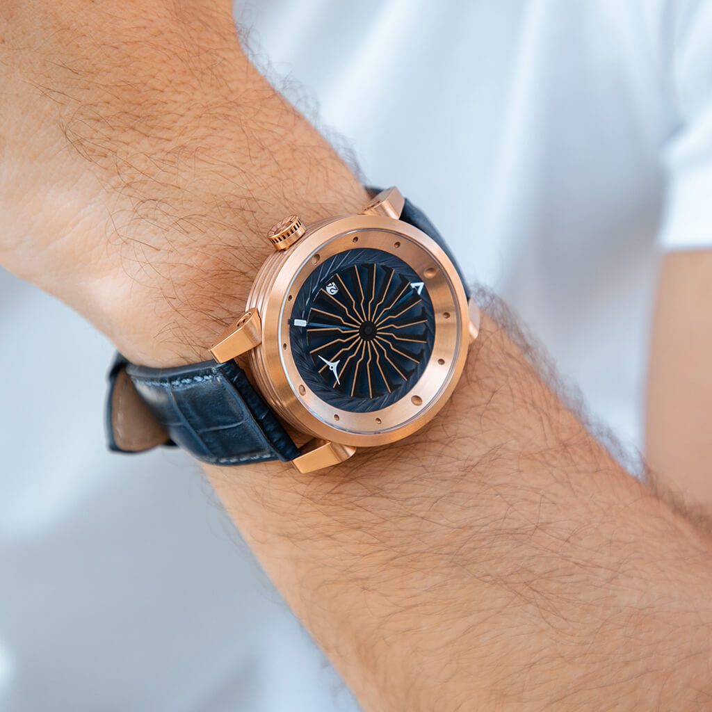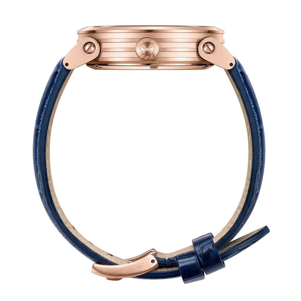 C’est d’ailleurs son boitier qui captive d’une puissante manière le regard. Sur la première image, on retrouve à 10 heures l’aiguille des heures (à la forme triangulaire) ; l’aiguille des minutes est quant à elle présente à 2 heures, en forme de petit bâtonnet cette fois. À équidistance, on retrouve à midi le logo ailé de la marque, démontrant une présence en toute légèreté.