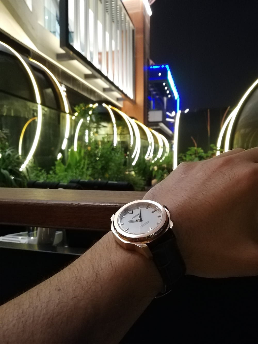 Aussi, le logo Nappey se retrouve à divers endroits, notamment au dos du bracelet ou encore sur la boucle ardillon. Enfin, la couronne vissée située à 3 heures à la forme parfaite, reprend les traits hexagonaux du boitier et permet notamment le remontage manuel de la montre ainsi que sa mise à l’heure. Subtile détail, cette couronne est habilement décorée de noir, assortie à la couleur du boitier.
