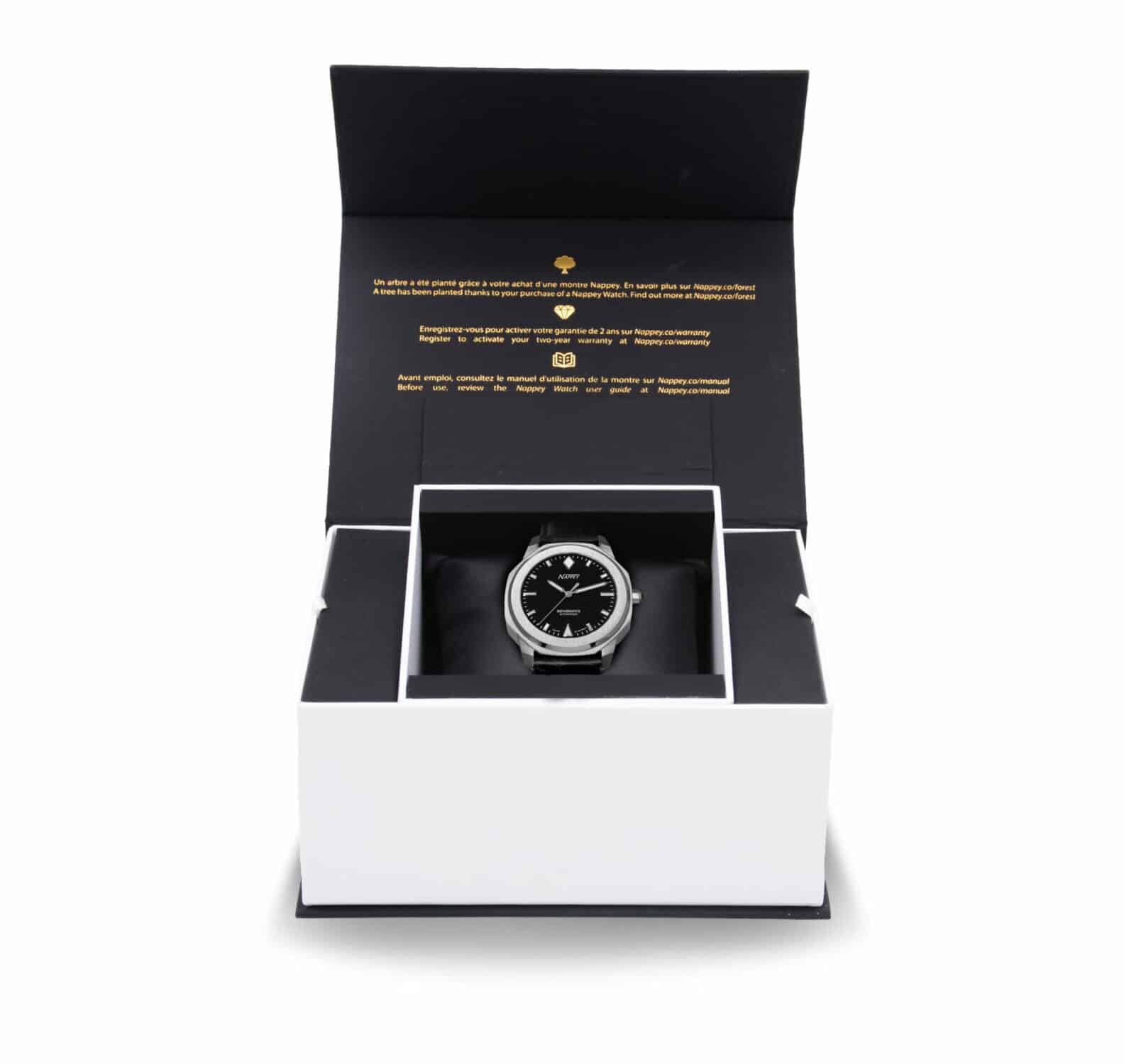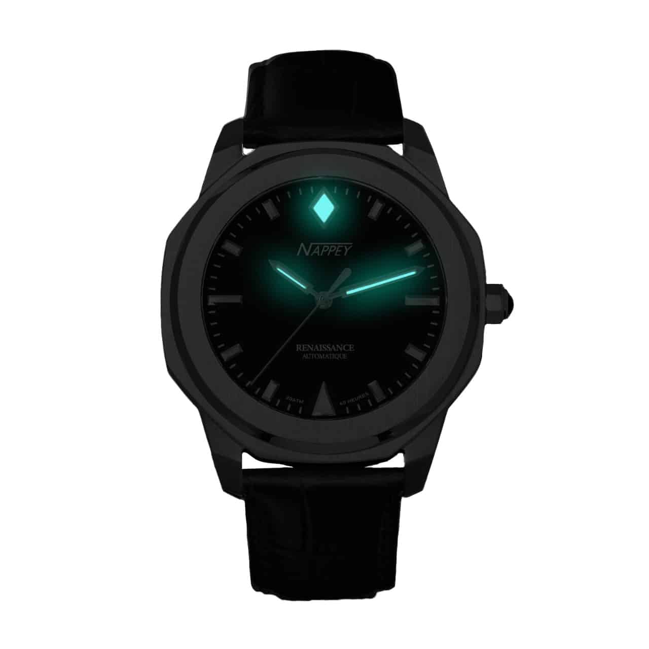 Aussi, le logo Nappey se retrouve à divers endroits, notamment au dos du bracelet ou encore sur la boucle ardillon. Enfin, la couronne vissée située à 3 heures à la forme parfaite, reprend les traits hexagonaux du boitier et permet notamment le remontage manuel de la montre ainsi que sa mise à l’heure. Subtil détail, cette couronne est habilement décorée de noir, assortie à la couleur du boitier.
