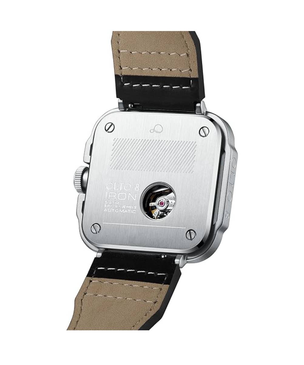 Avec son boîtier rectangulaire de 46 mm en acier inoxydable, cette Iron X affiche une allure moderne et audacieuse. Son cadran noir met en valeur l’affichage analogique au format 12 heures, tandis que le verre protecteur assure une excellente résistance aux rayures. L’épaisseur de 12,5 mm souligne le style puissant propre à OLTO-8.
