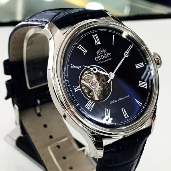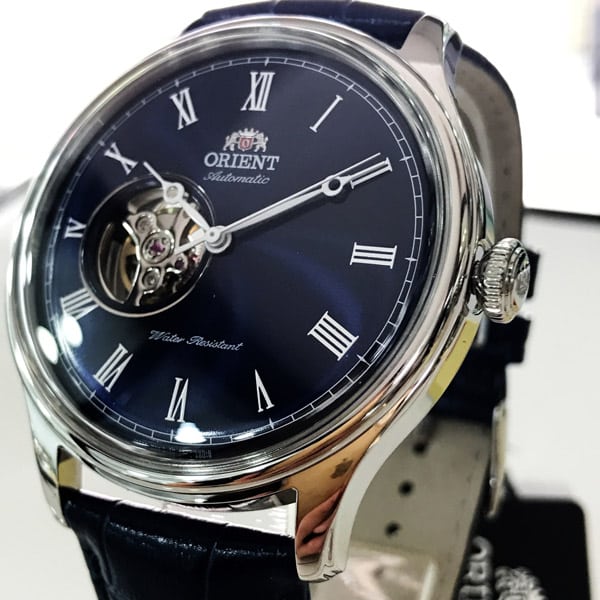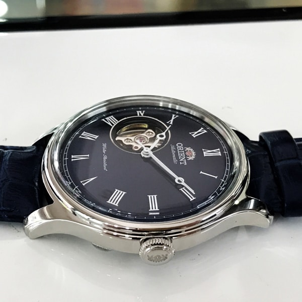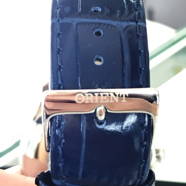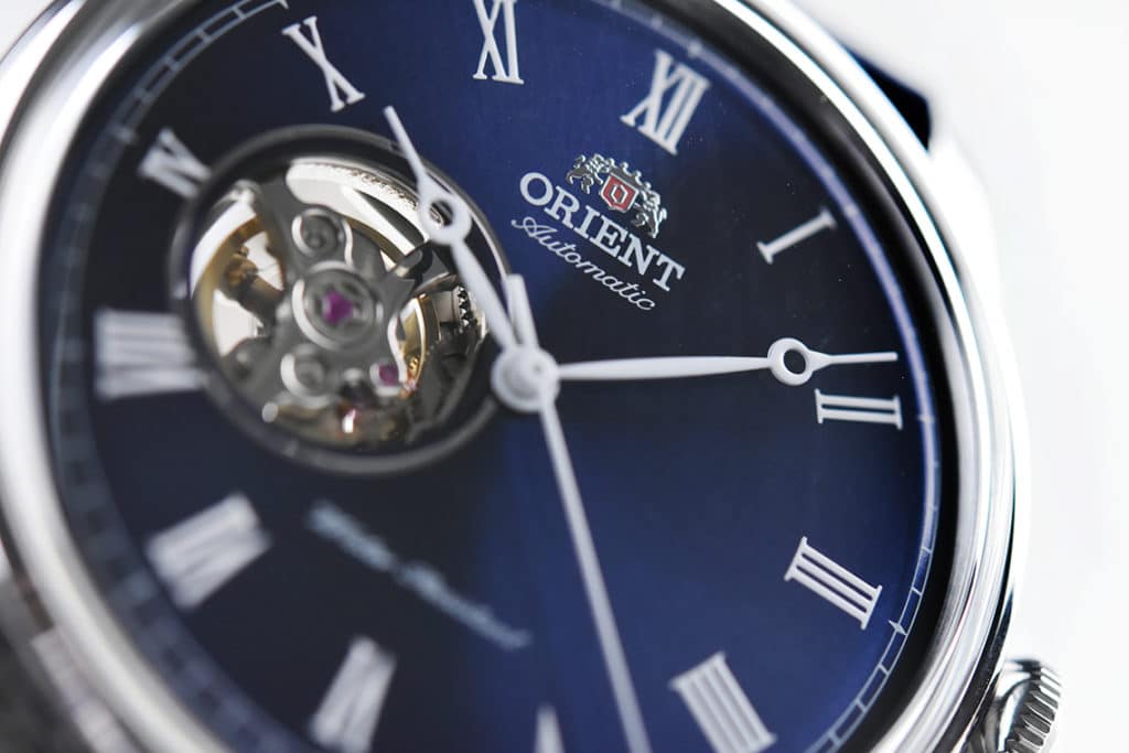 Cette Orient Envoy a été habilement conçu pour rendre hommage aux montres vintages. Cela passe notamment par des index en chiffres romains, entourés d’une graduation en chemin de fer, ainsi que des aiguilles d’heure et de minute au style particulièrement ancien.