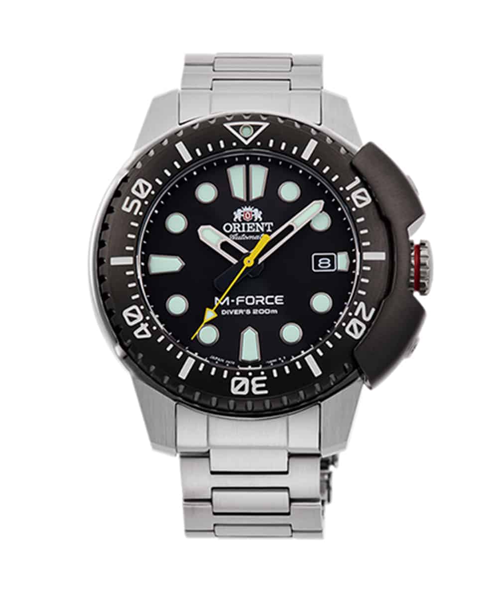 Possédant les mêmes qualités que sa consœur (indicateur de jour/date, lunette unidirectionnelle, construction solide, 200 mètres d’étanchéité), l’ Orient M-Force fait partie de la catégorie « Divers Watch » comprenez « plongeuse » de la marque filiale de Seiko.