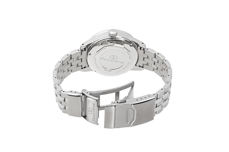 Au dos de la montre, le mouvement se dévoile chaque seconde laissant apparaître les oscillations du balancier. Ce théâtre mécanique est entièrement visible grâce au fond de boite transparent, spécialement conçu en verre saphir par Orient Star.