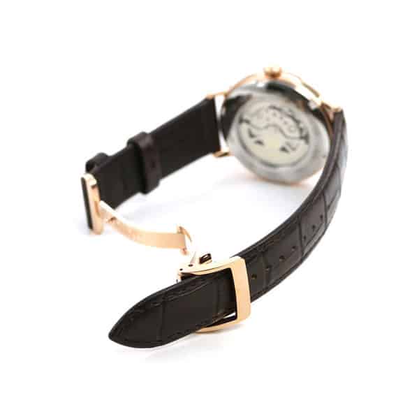 Verre saphir, aiguilles affinées, indicateur de réserve de marche et date à 3 heures s’emboîtent ici avec élégance et perfection. Son cadran blanc est quant à lui assorti à un bracelet marron avec soin.