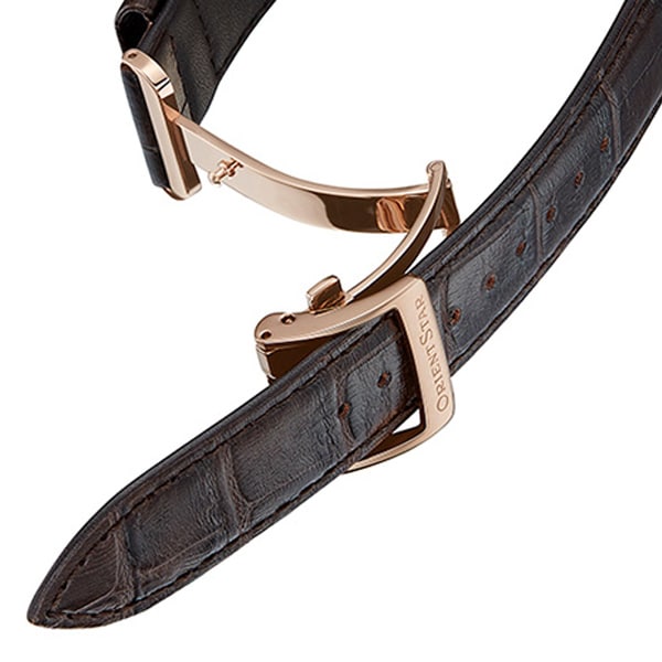 Cette finesse et ce sens du détail se retrouvent également avec grand art à deux endroits bien distincts ; la couronne est gravée du logo Orient Star ainsi que la masse oscillante, que l’on peut observer au dos de la montre, où y est inscrit le nom de la marque, son logo et son origine : le Japon.