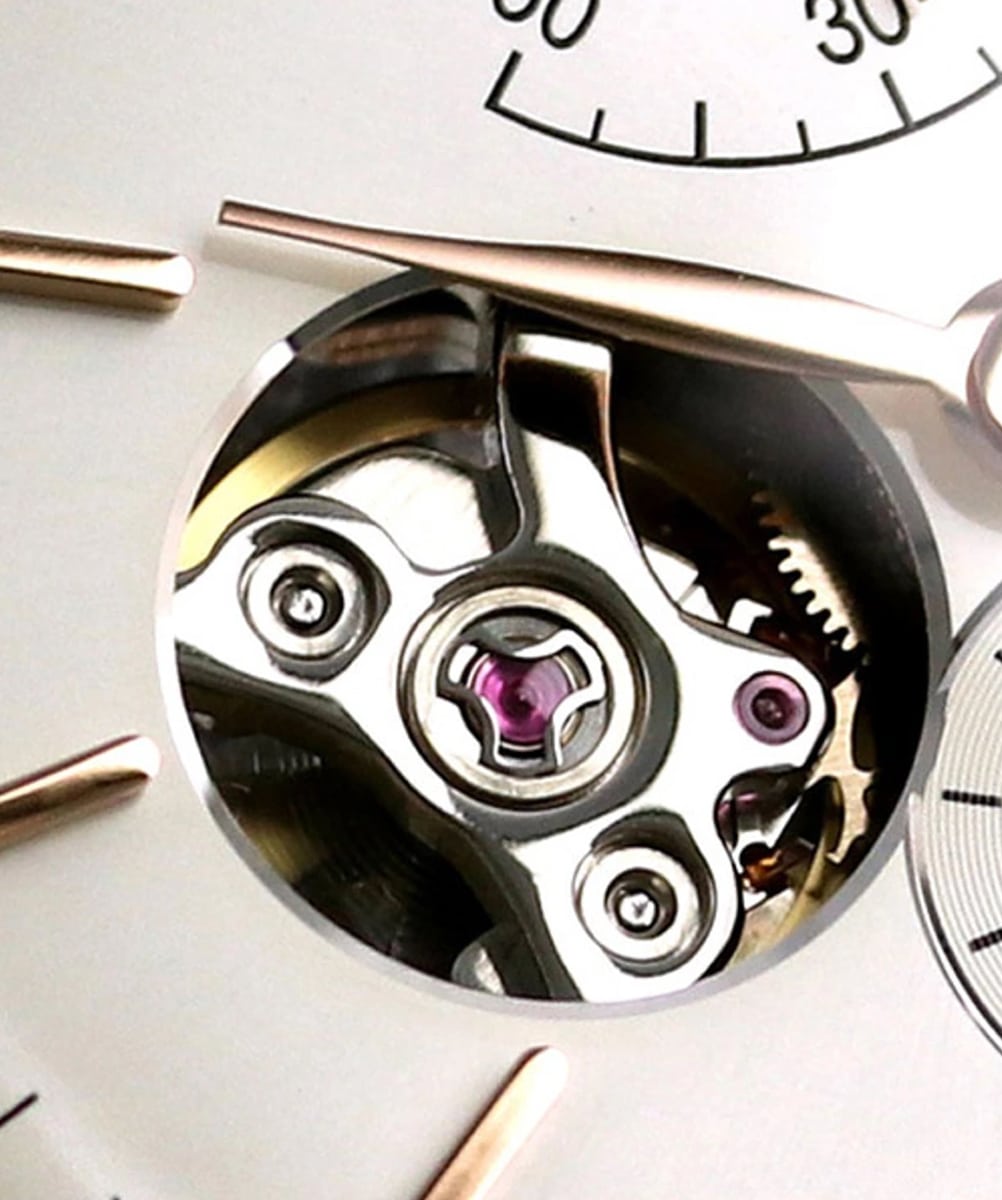 Pour les amateurs de précision, ce mécanisme possède un dernier détail loin d’être négligeable, un stop seconde. Cette fonction permet à l’aiguille des secondes de s’arrêter afin d’offrir une heure des plus pointilleuses.