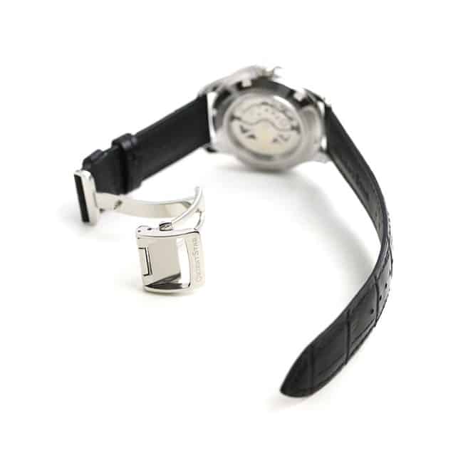 - Le boitier dispose d’un fond en verre transparent, permettant au porteur d’observer le mécanisme en toute condition.
