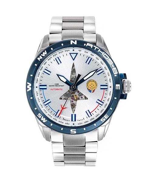 La découpe d’un Alphat Jet sur le cadran de notre montre Homme Automatique en acier Athos 8 A8-100ED-668094 fait écho aux avions profilés de la PAF. Cette montre de haute voltige laisse entrevoir son mouvement automatique 21 rubis. Un mécanisme automatique pour avoir toujours un coup d’avance.