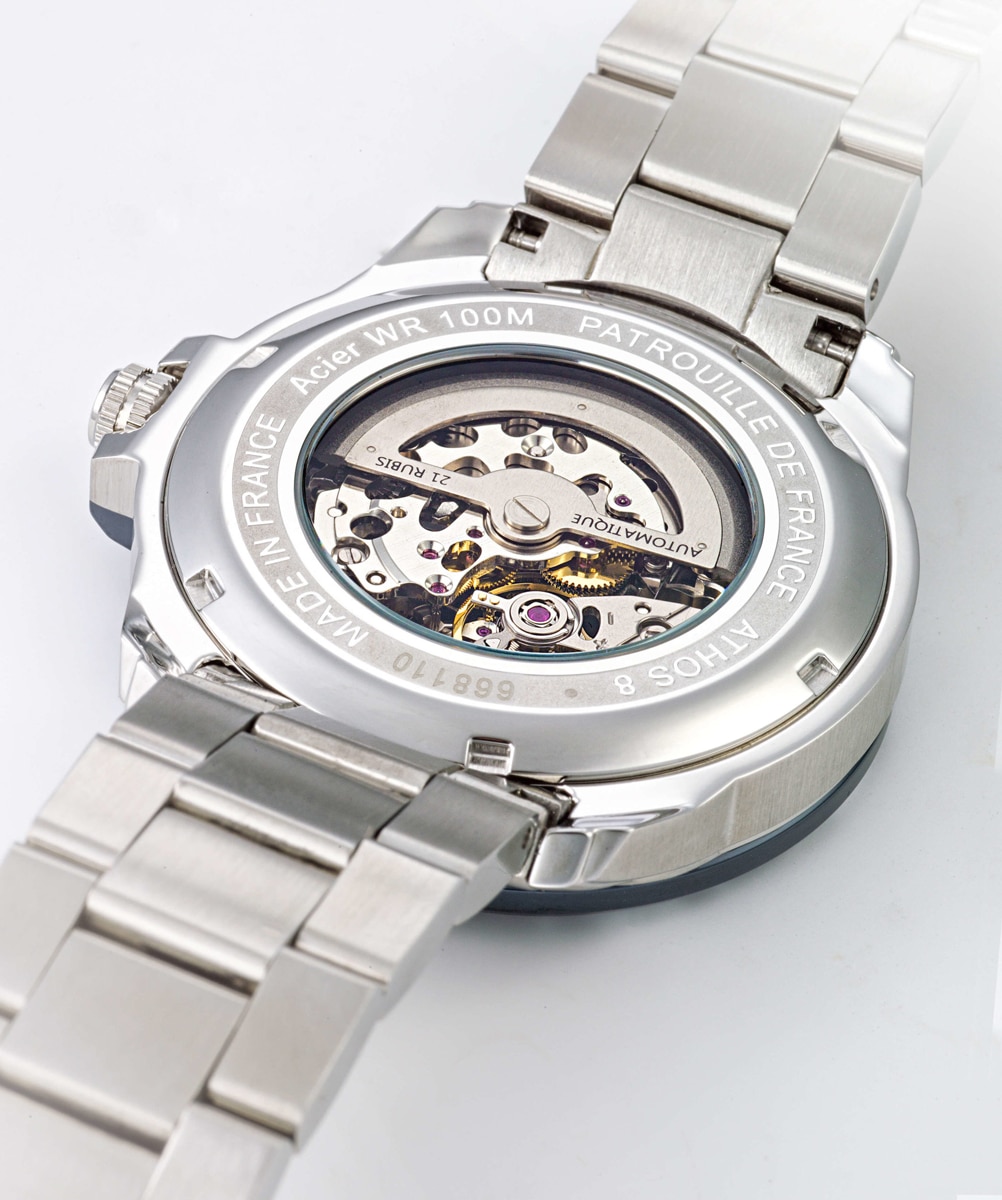 La Patrouille de France Athos 8 se distingue par son design exceptionnel, marqué par des lignes épurées et des détails soigneusement travaillés. Le boîtier en acier inoxydable de haute qualité offre une robustesse à toute épreuve, tandis que le cadran bleu contraste avec des index lumineux, assurant une lisibilité optimale, même dans des conditions de faible luminosité.