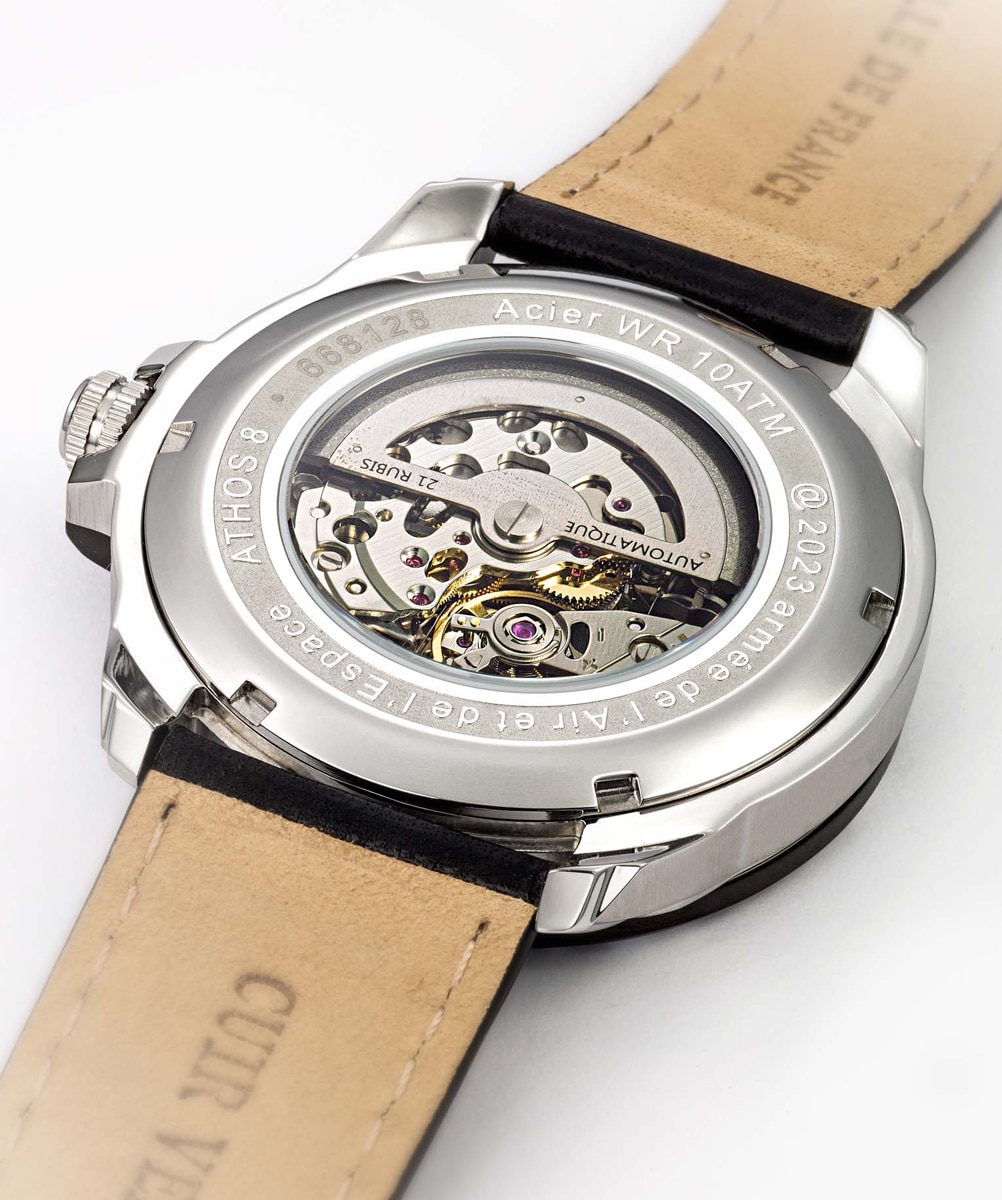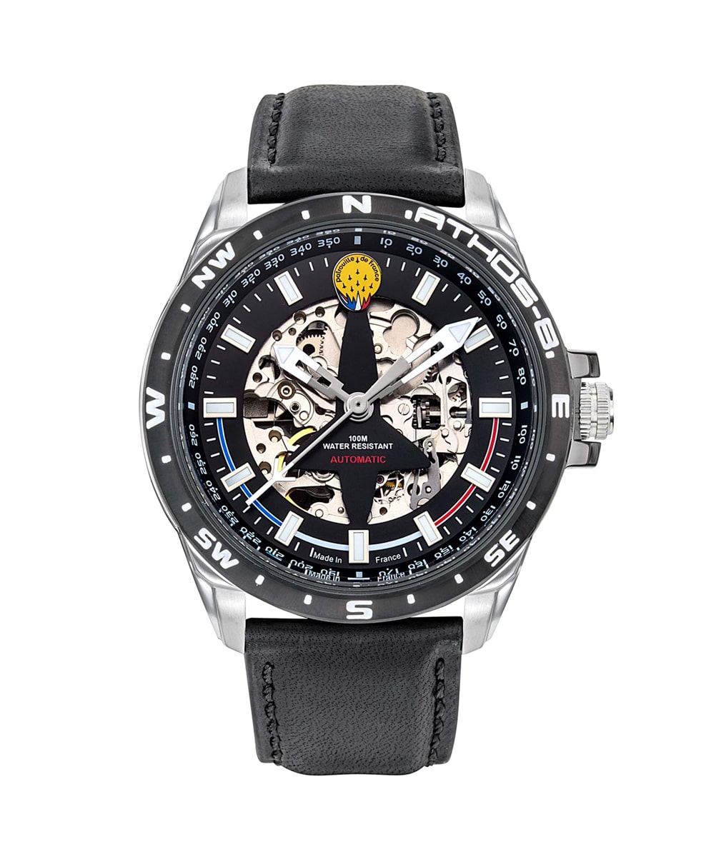 La Patrouille de France Athos 8 se distingue par son design exceptionnel, marqué par des lignes épurées et des détails soigneusement travaillés. Le boîtier en acier inoxydable de haute qualité offre une robustesse à toute épreuve, tandis que le cadran noir contraste avec des index lumineux, assurant une lisibilité optimale, même dans des conditions de faible luminosité.