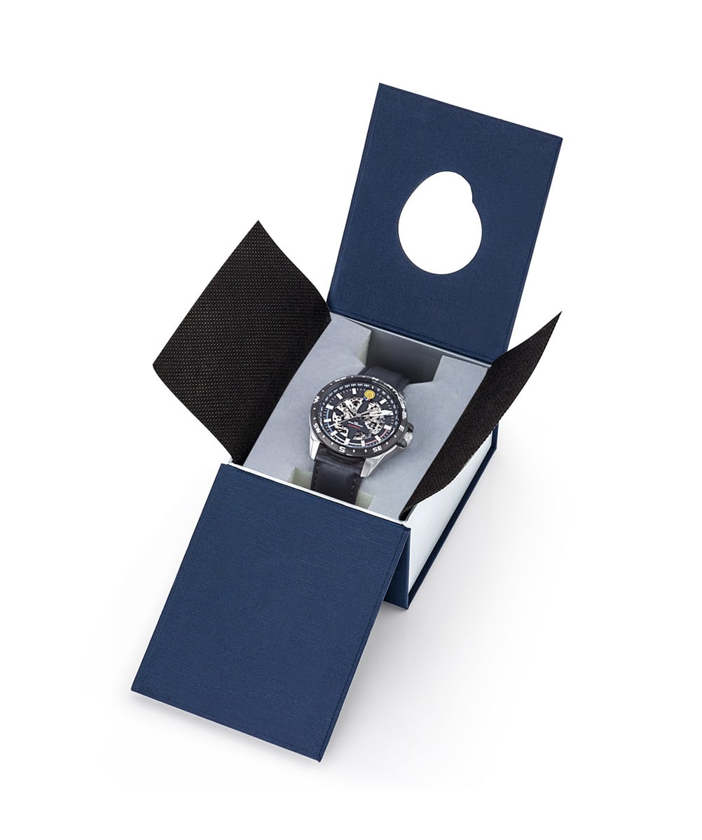 Le bracelet en cuir, gravé du logo emblématique de la Patrouille de France, ajoute une touche de sophistication à cette montre. Confortable à porter au quotidien.