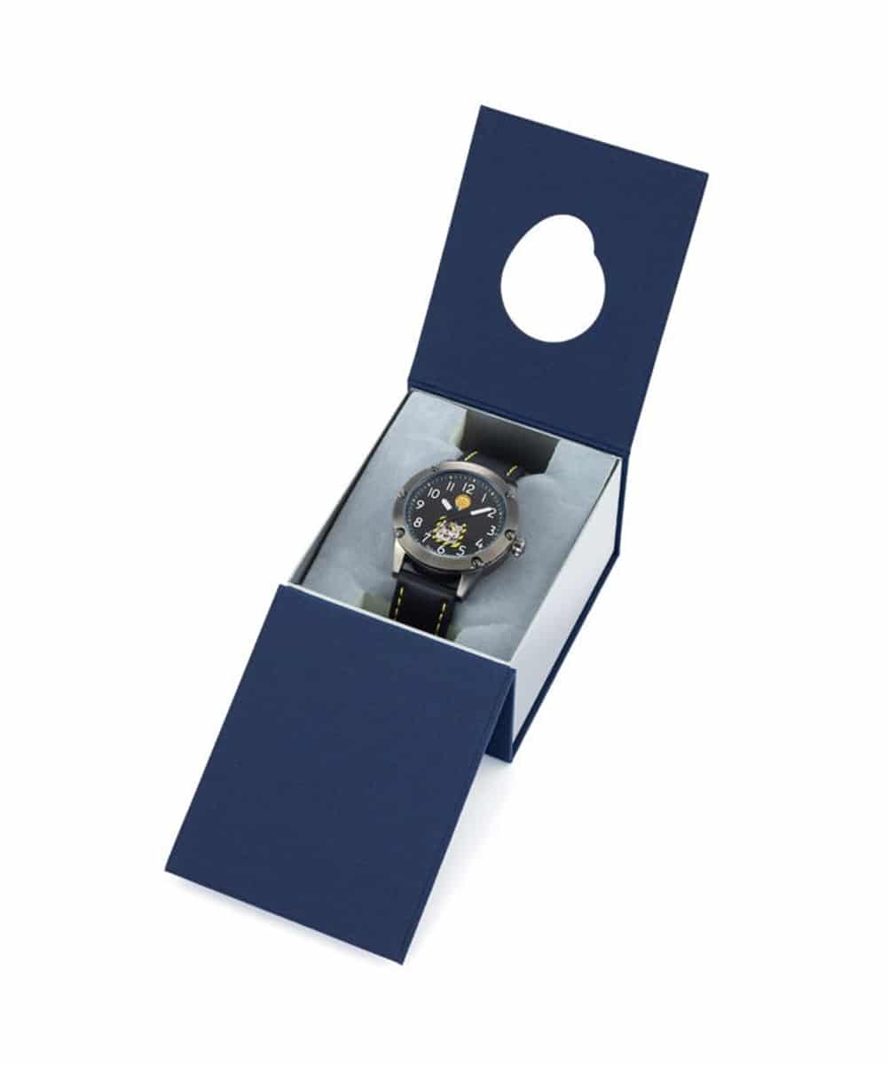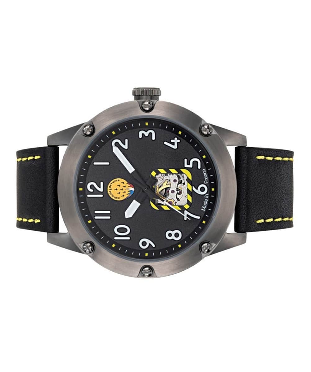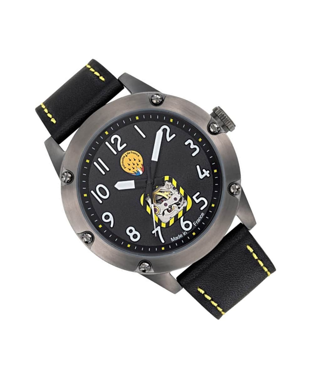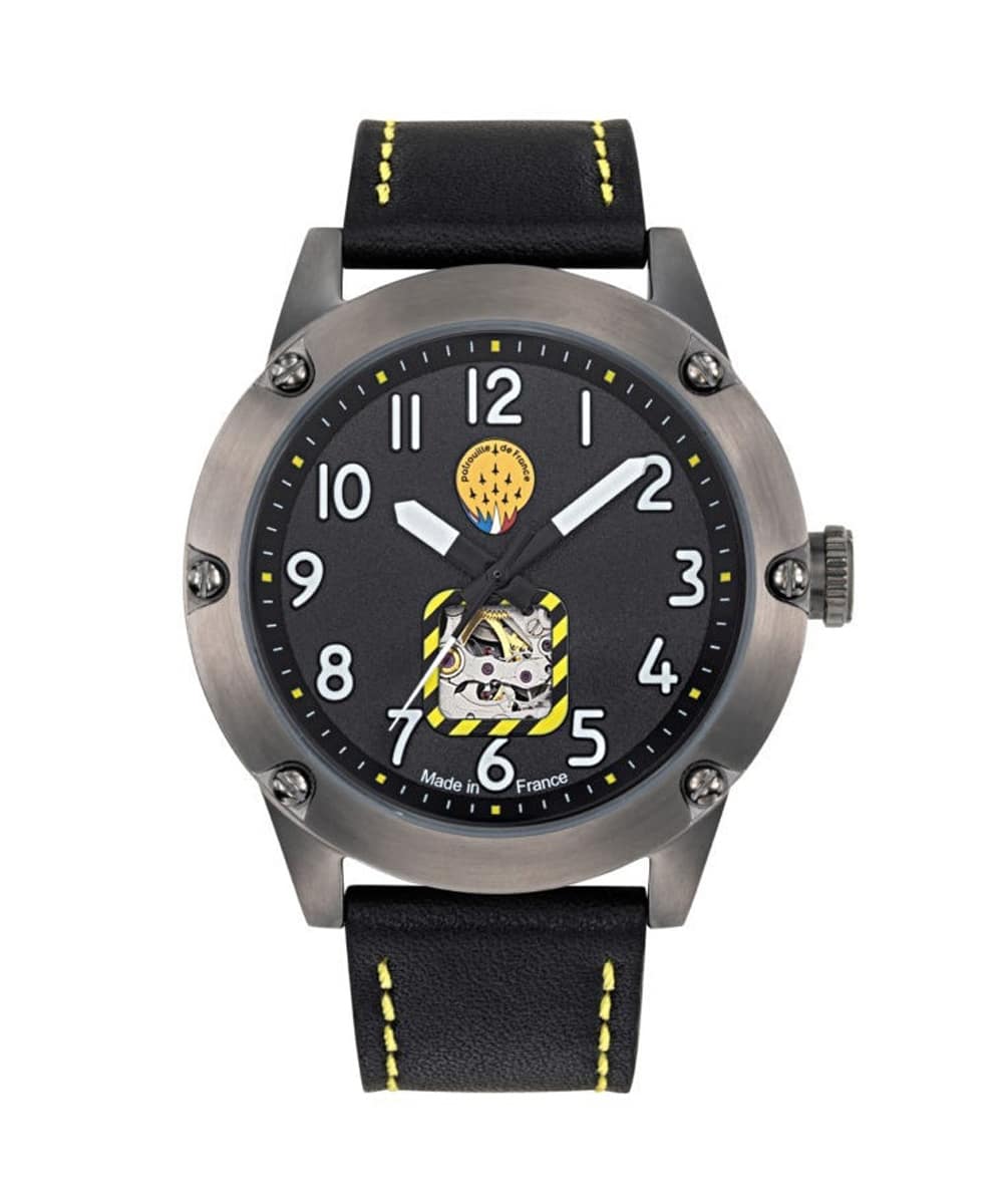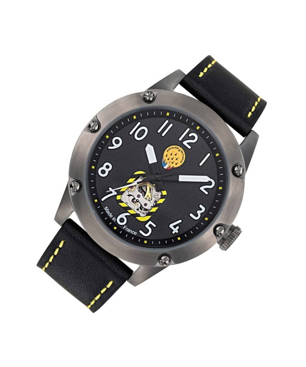 Le fond du boîtier est gravé du logo officiel de la Patrouille de France, ajoutant une touche exclusive à cette pièce d’exception. La lunette tournante unidirectionnelle, rappelant un altimètre, renforce le caractère aéronautique de la montre, tandis que le bracelet en cuir de qualité supérieure assure un confort optimal et une durabilité accrue.