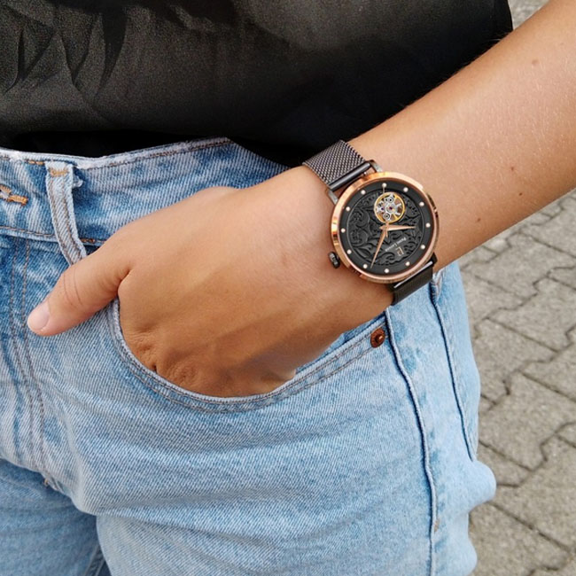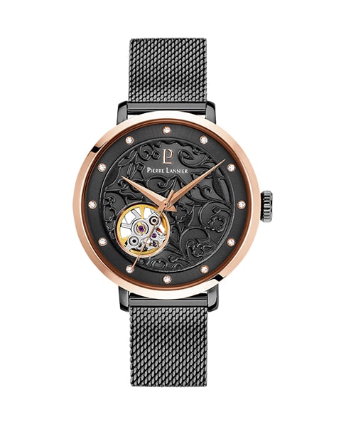 Ce modèle de montre femme possède un boîtier en acier inoxydable de 37 mm de diamètre aux teintes noir anthracite en relief. Ses aiguilles et ses index fins de la même teinte ressortent sur le cadran, qui possède un effet soleillé avec une teinte rose dorée. En son cœur, vous pourrez découvrir le squelette du mouvement automatique : une petite ouverture vous permet de vous laisser charmer par la performance du mécanisme automatique de la montre Femme 310F988 acier milanais. D’un simple geste du poignet, remontez votre montre. Plus besoin de piles.