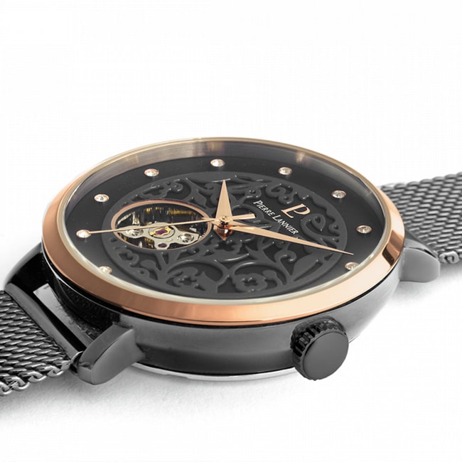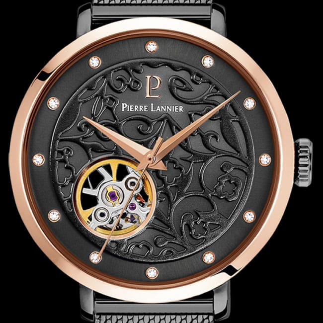 Un mouvement automatique équipe cette montre Pierre Lannier pour femme.