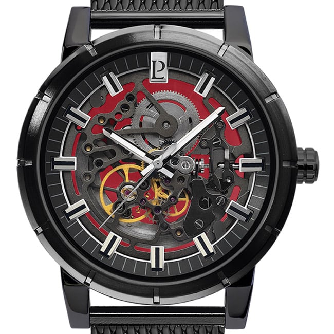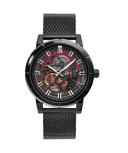 Ce modèle de montre homme possède un boîtier en acier inoxydable de 45 mm de diamètre aux teintes noir et rouge. Ses aiguilles et ses index dorés ressortent sur le cadran d’une manière idéale.