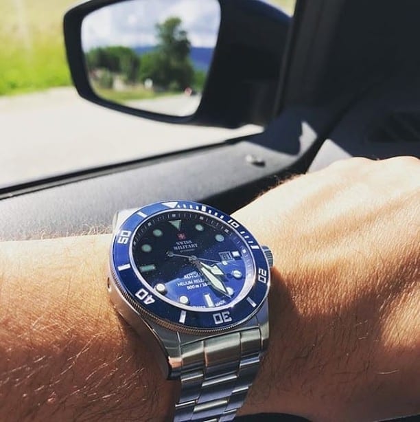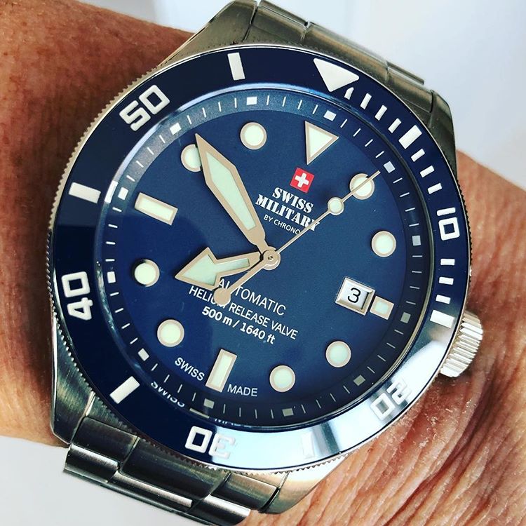 La nuit venue, on appréciera l’extrême lisibilité de la Swiss Military Deep Blue SMA34075-02 apportée par le SuperLuminova, un composant non toxique, rendant index et aiguilles visibles en toute condition…